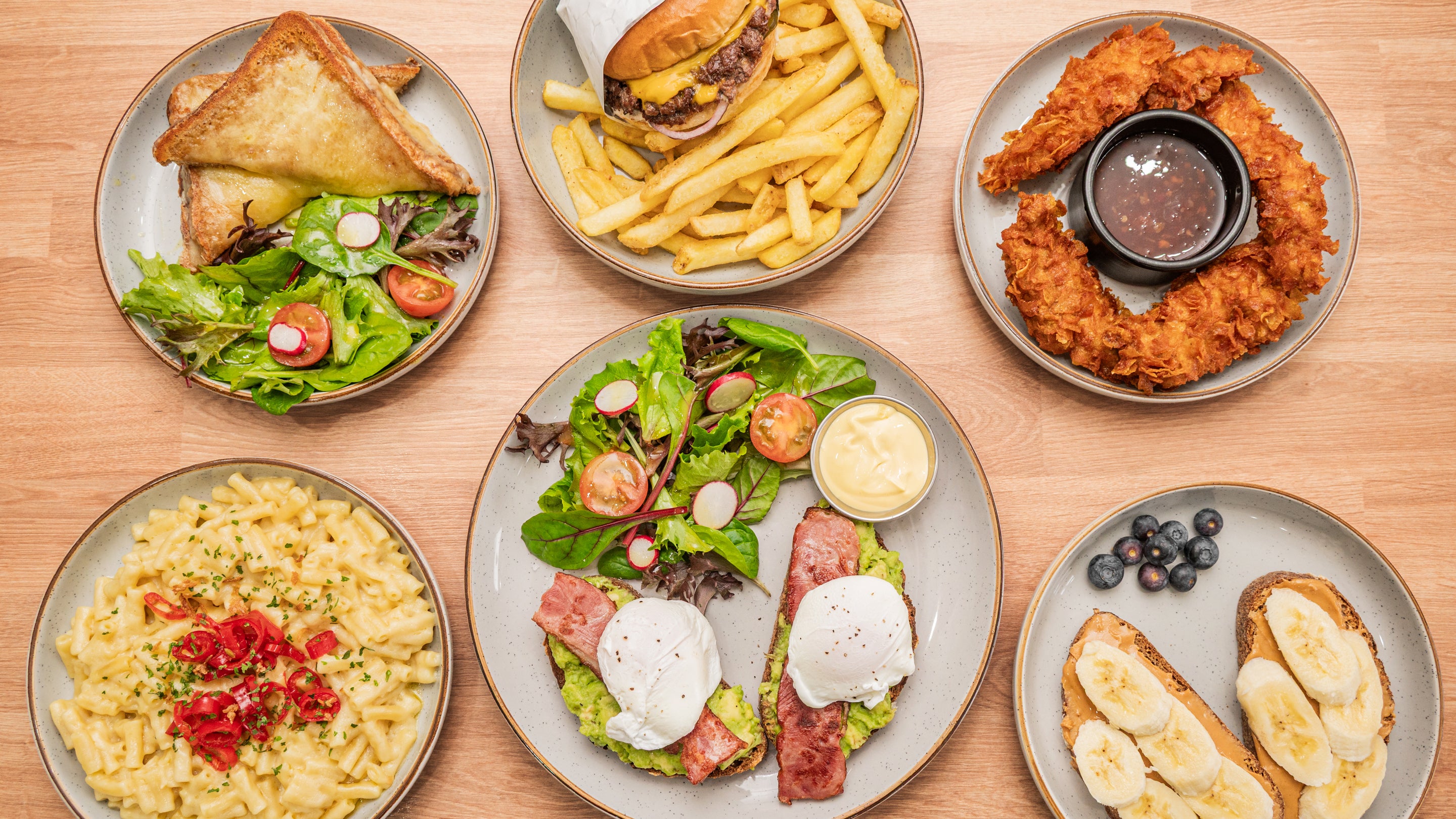 Cheesy beans, avocado and boiled eggs, cream cheese and salmon, peanut butter and grapes, all served on sourdough toast£11.00