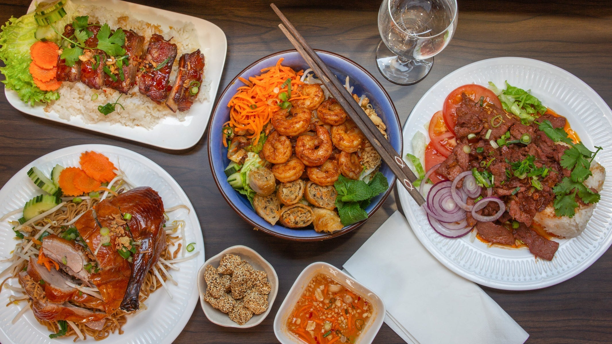 All plates include room-temperature rice vermicelli with fresh herbs, cucumber, carrots, radish daikon, lettuce with topping of your choice, garnished with roasted peanuts, fried shallots