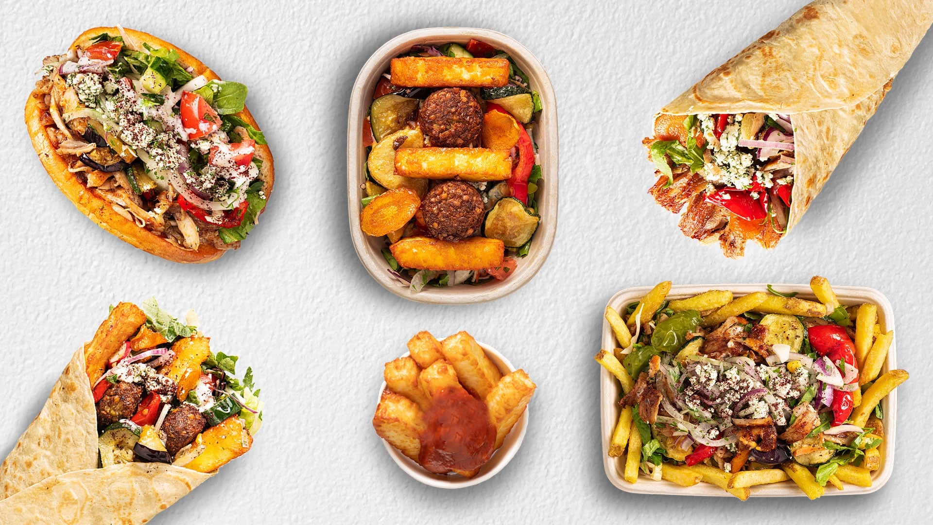 Salad Box with Golden fried Halloumi and Chickpea Falafels, with Garlic, Cocktail and mild Chilli Sauces and our marinated House Vegetables, plus fresh Green Salad, Tomato and Cucumber Salad, Onions, Feta Cheese and touch of Sumac.£9.90VegetarianHalloumi And Falafel Wrap