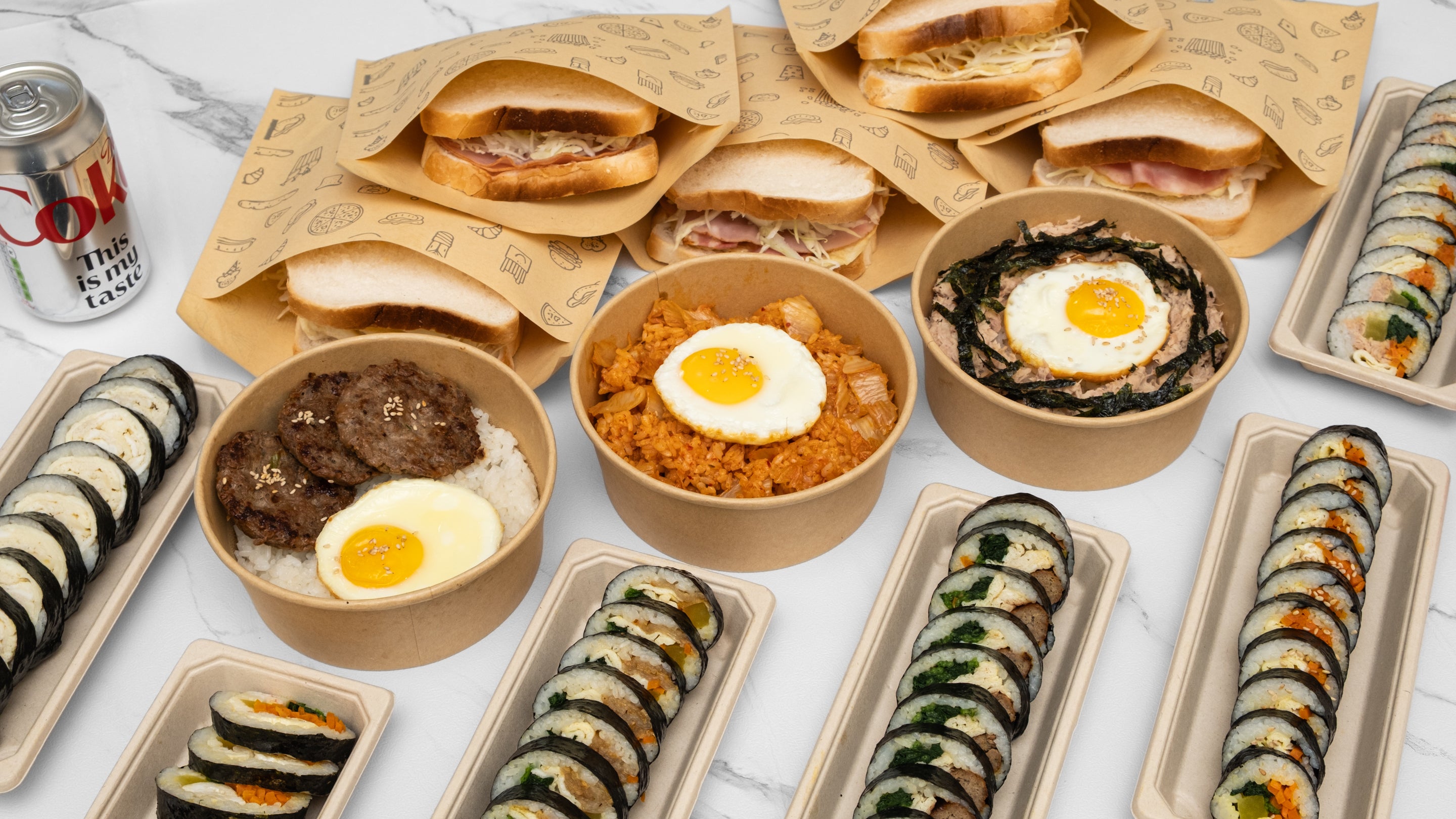 Tteokgalbi Kimbap+ Tteokgalbi Korean style Toast.-Kimbap. Tender beef&Pork marinated in a sweet and savory sauce. Served with rice,seaweed,pickled radish,spinach,carrot,sesame,mustard,soybeansToast. Korean street style. Tender beef&Pork marinated in a sweet and savory sauce. Served with bread,eggs,cabbage,kiwi dressing,mayo£16.50Korean favorite meal