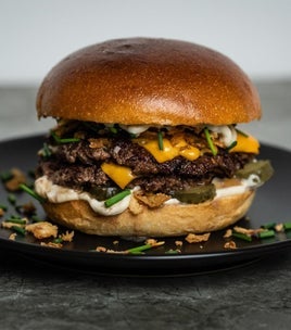 Aged beef smash patty served in a fluffy potato brioche bun with cheese, truffle mayo, crispy onions, chopped chives & sliced pickles£7.00PopularRoyal Cheeseburger