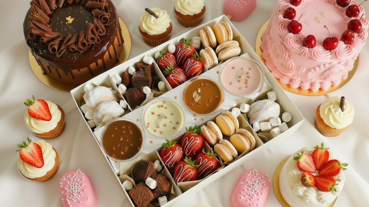 Mixed Dipping Box, perfect for sharing with friends or family. Treats include brownies, mini donuts, dipped strawberries and macarons. Please note macarons contain tree nuts.£45.00Vegetarian