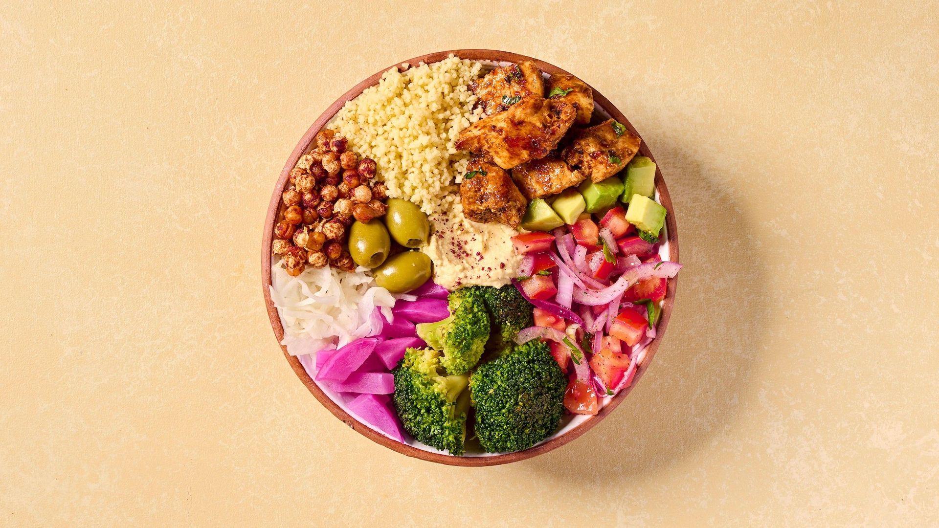 Highly rated· A skewer of Shish Taouk with hummus, baked sumac chickpeas, chalkidiki olives, banadoura w basel salad, avocado, cous cous, grilled broccoli, pickled cabbage, pickled turnip, parsley and your choice of sauce.£11.45Chicken Shawarma Power Bowl