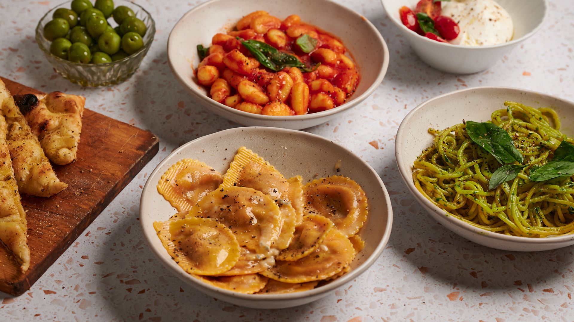 Pick the Sauce first, then choose the Pasta: Potato Gnocchi, Fresh Spaghetti, Fresh Pappardelle
