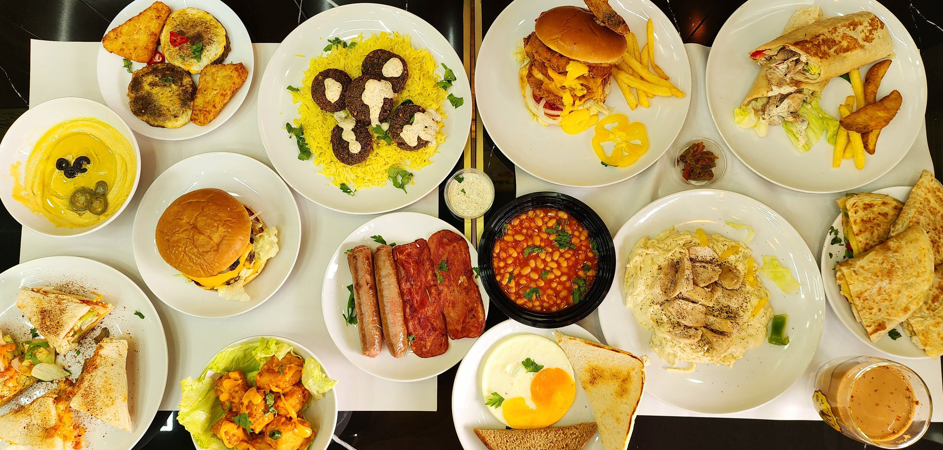 1. Bread 2. Eggs 3. Hash Brown 4. Gravy 5. Halal Turkey Rashers 6. Halal Sausages 7. Dips & 8. Drink£11.85HalalArabic MeẔẔe~8 Vegetarian Flavors