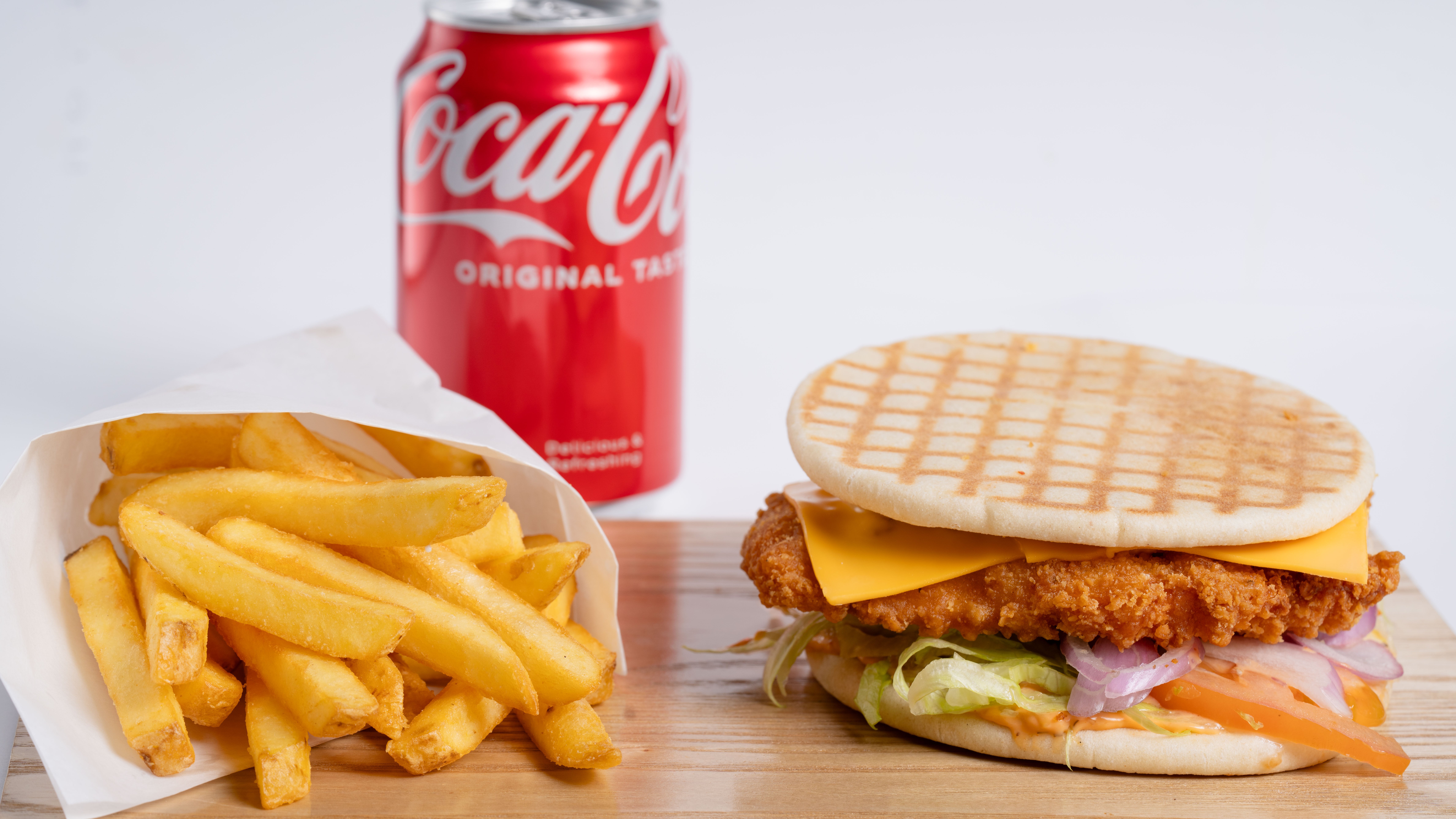 Relish the crispy chicken schnitzel burger, boasting a golden chicken patty topped with a single cheese slice, fresh lettuce, ripe tomatoes, and sliced onions, all unified by our signature house sauce. Encased in soft pitta, it delivers a harmonious crunch and creaminess that's utterly addictive.£10.50Meal Deal Burger