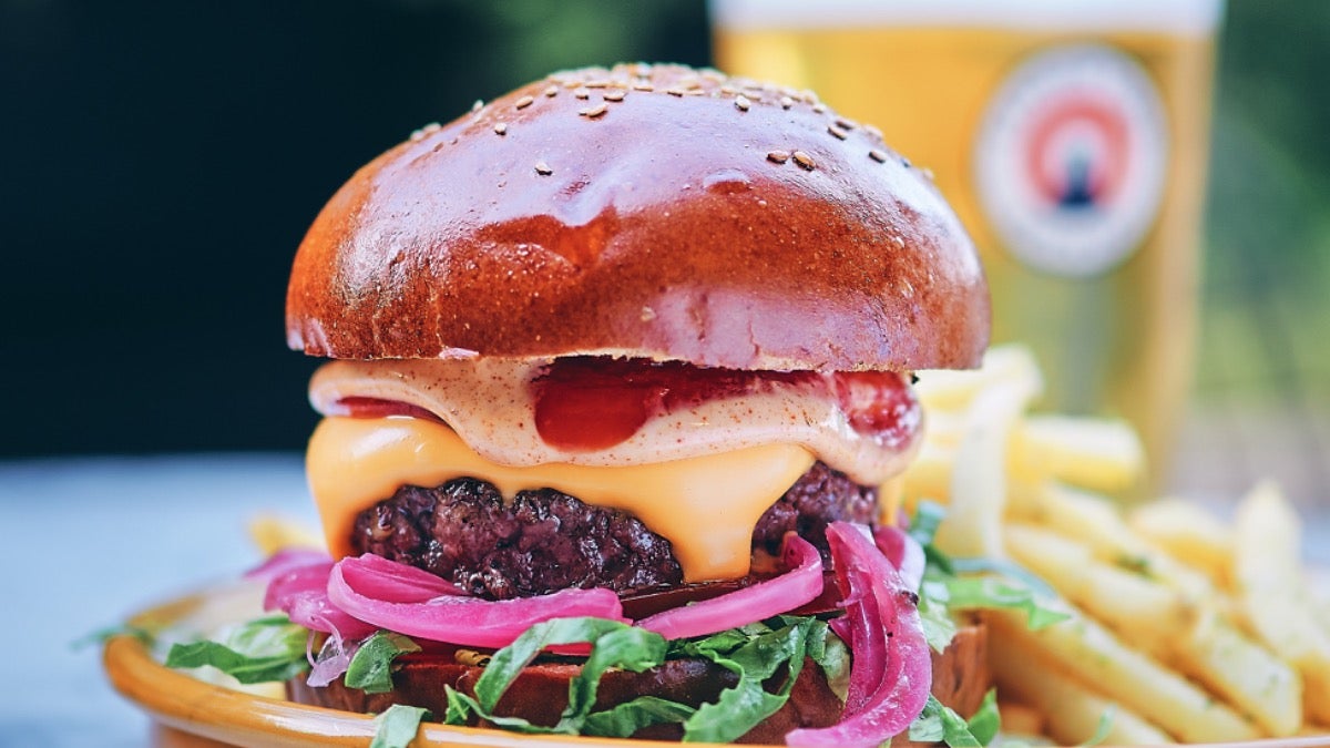 Highly rated· 28-day dry-aged, grass-fed British beef patty, complemented two slices of American cheese, baby gem lettuce, ripe tomato, homemade pickled red onions, ketchup, and smoky mayo, all nested in a soft brioche bun from our local bakers.£11.90Beefy Beefy