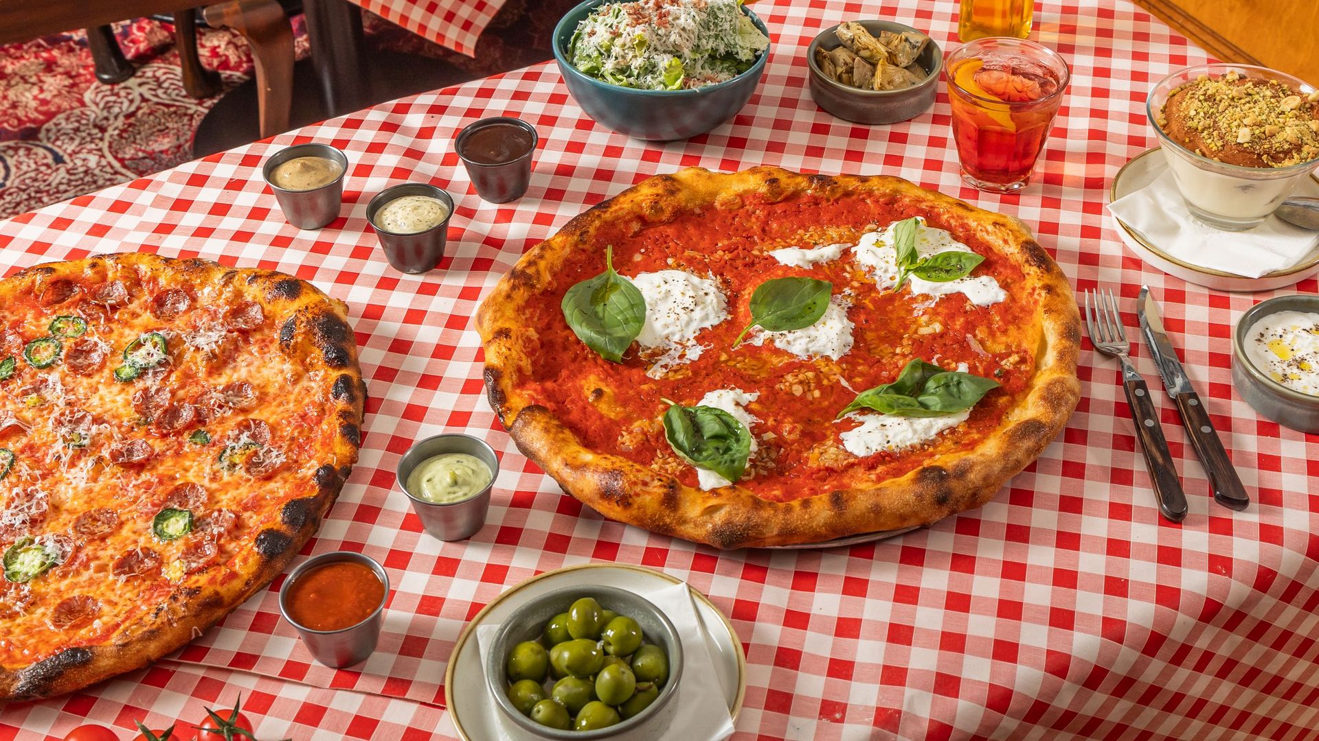 Tomato sauce, aged mozzarella, smoked pepperoni, jalapeño, honey, and shaved parmesan.4.2(15)£19.00PopularMARGHERITA