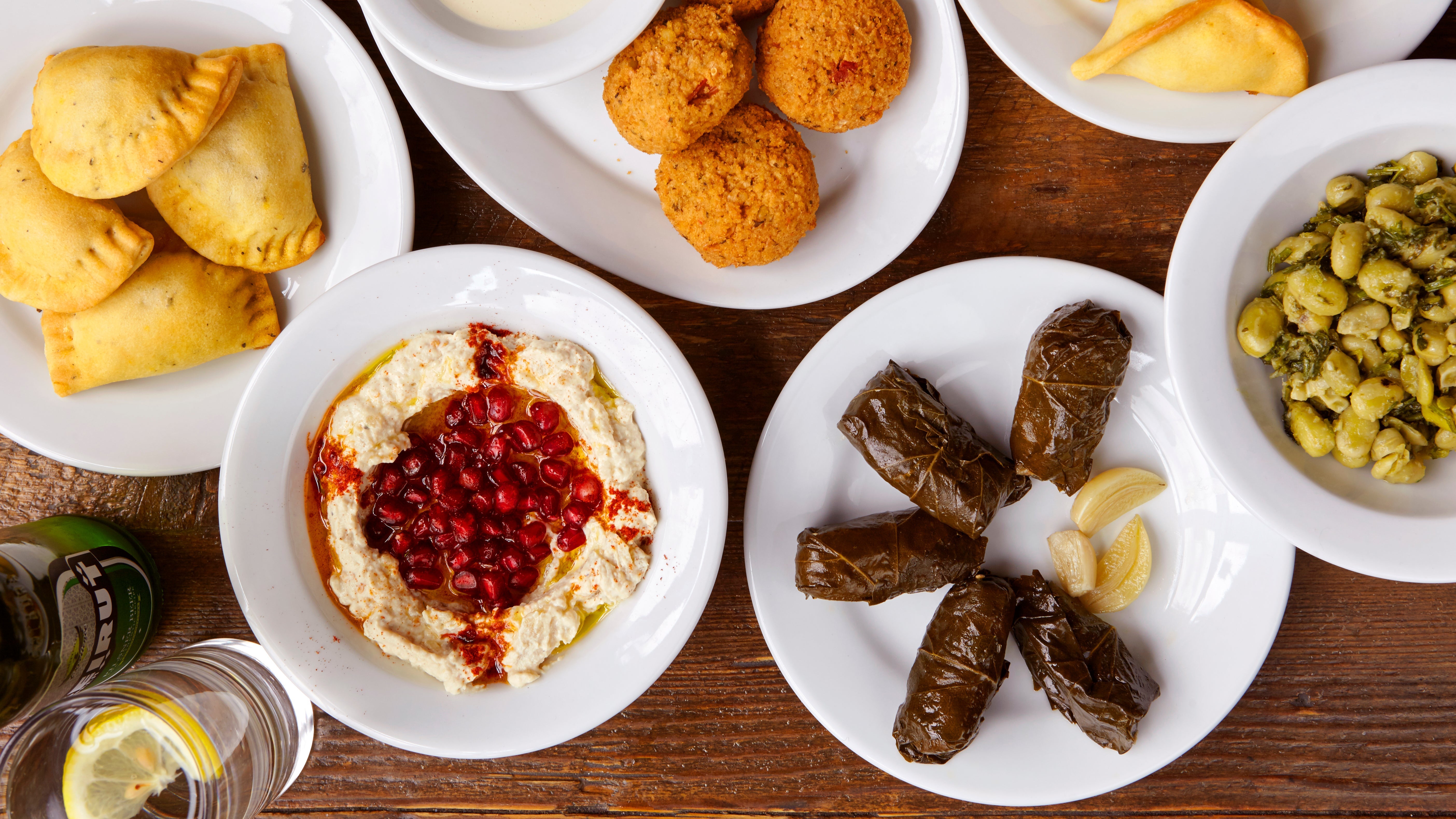 Hummus, moutabal, grilled haloumi, falafel, cheese sambosic, spinach fatayer, salad & bread. Vegetarian.