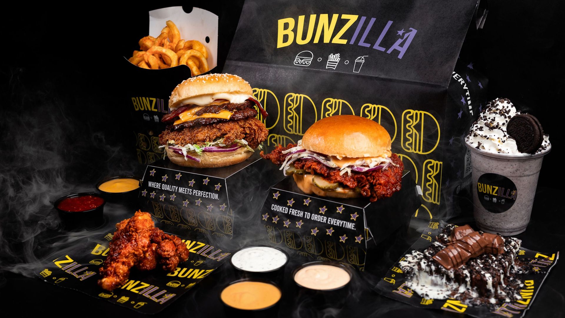 Classic smash burger + tender BQQ & tender lemon&herb + beef loaded fries + Bunzilla sauce.£16.95Popular