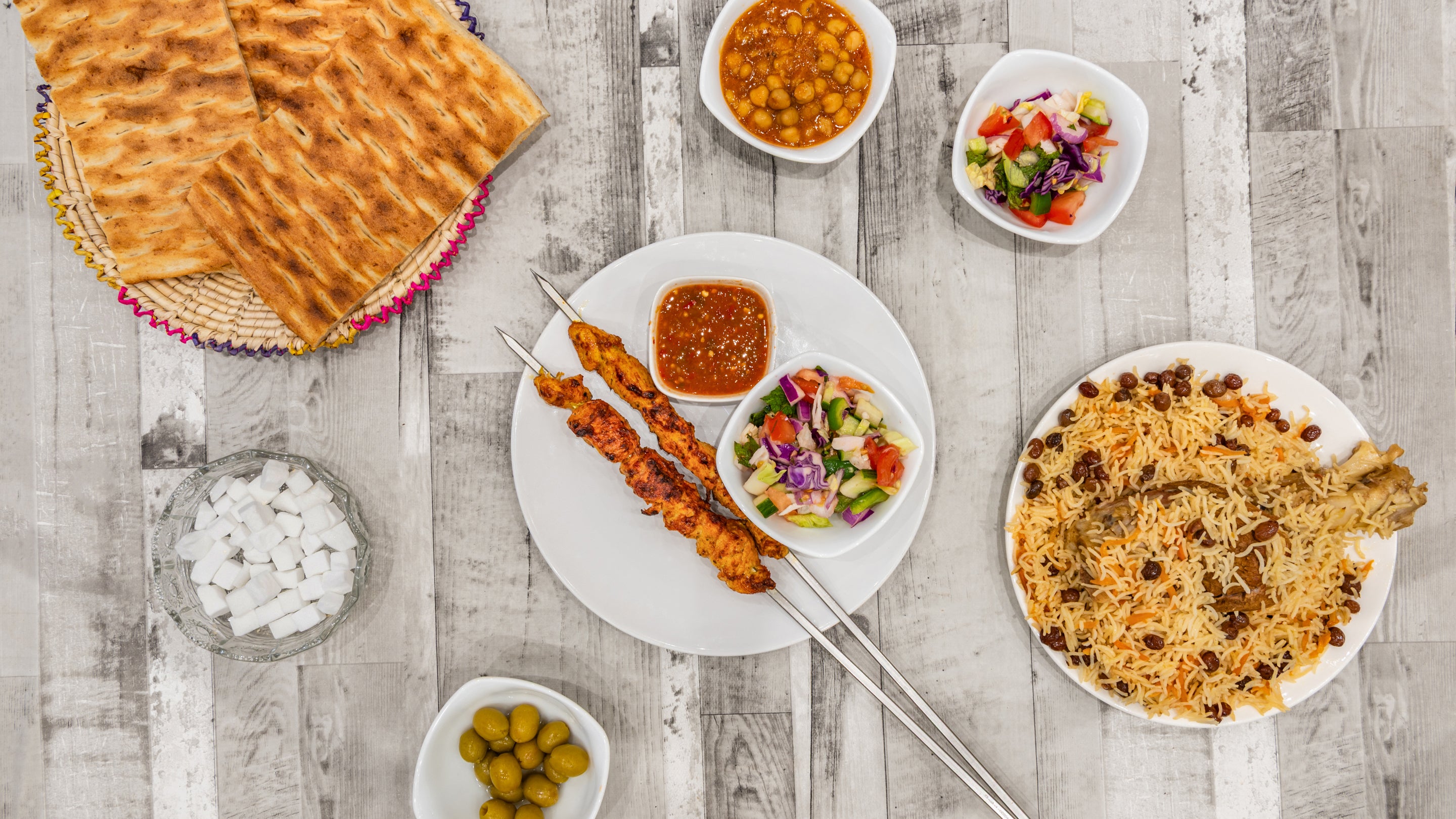 2 Qabuli Pulao + 1 kg Chicken Karahi + Fresh Fruit + Apple Juice + 2 Side Dishes + 4 Naan + Tea ( 4 people )£60.00