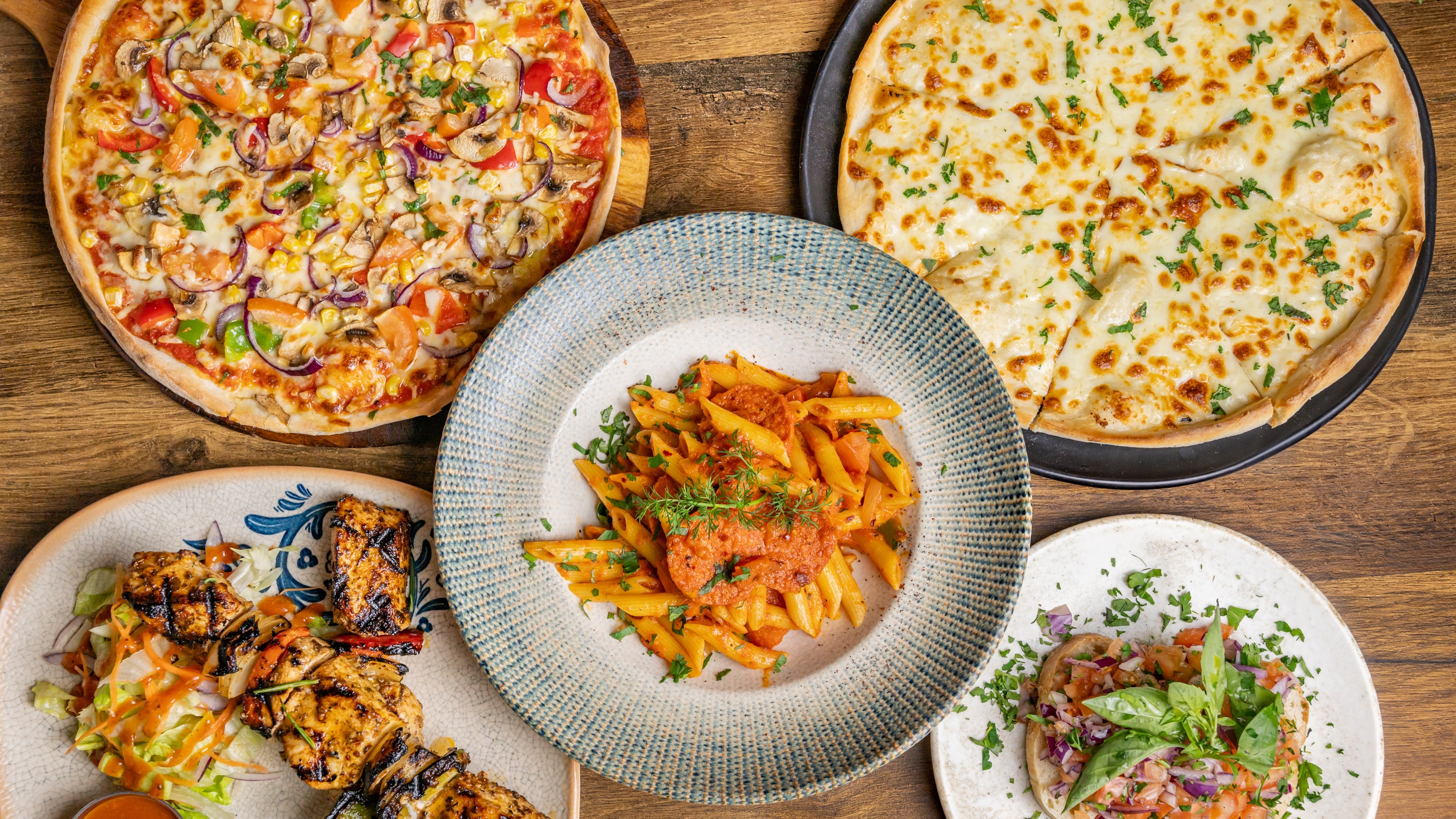 Skewered minced chicken wrapped in bread, butter glaze on top served with rice & yogurt.£17.95HalalVegetarian Skewers