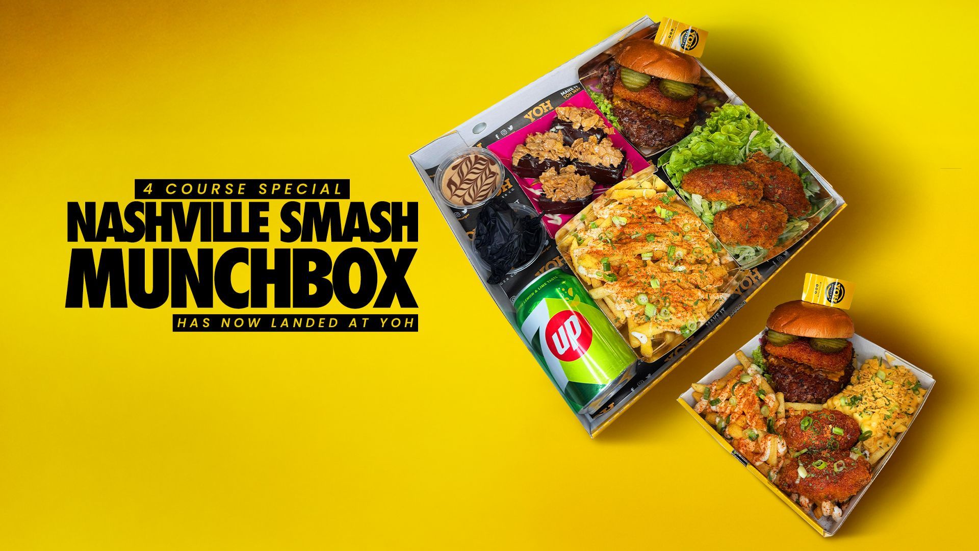 Enjoy the signature YOH Mac N Cheese Burger, rich and Loaded Mac N Cheese Fries, freshly baked Parmesan Garlic Brioche, handmade Golden Mac N Cheese Bites, and perfectly seasoned House Fries — all freshly prepared in-store and brought together in one irresistible box.£22.95Beef Nashville Mini Munch Box