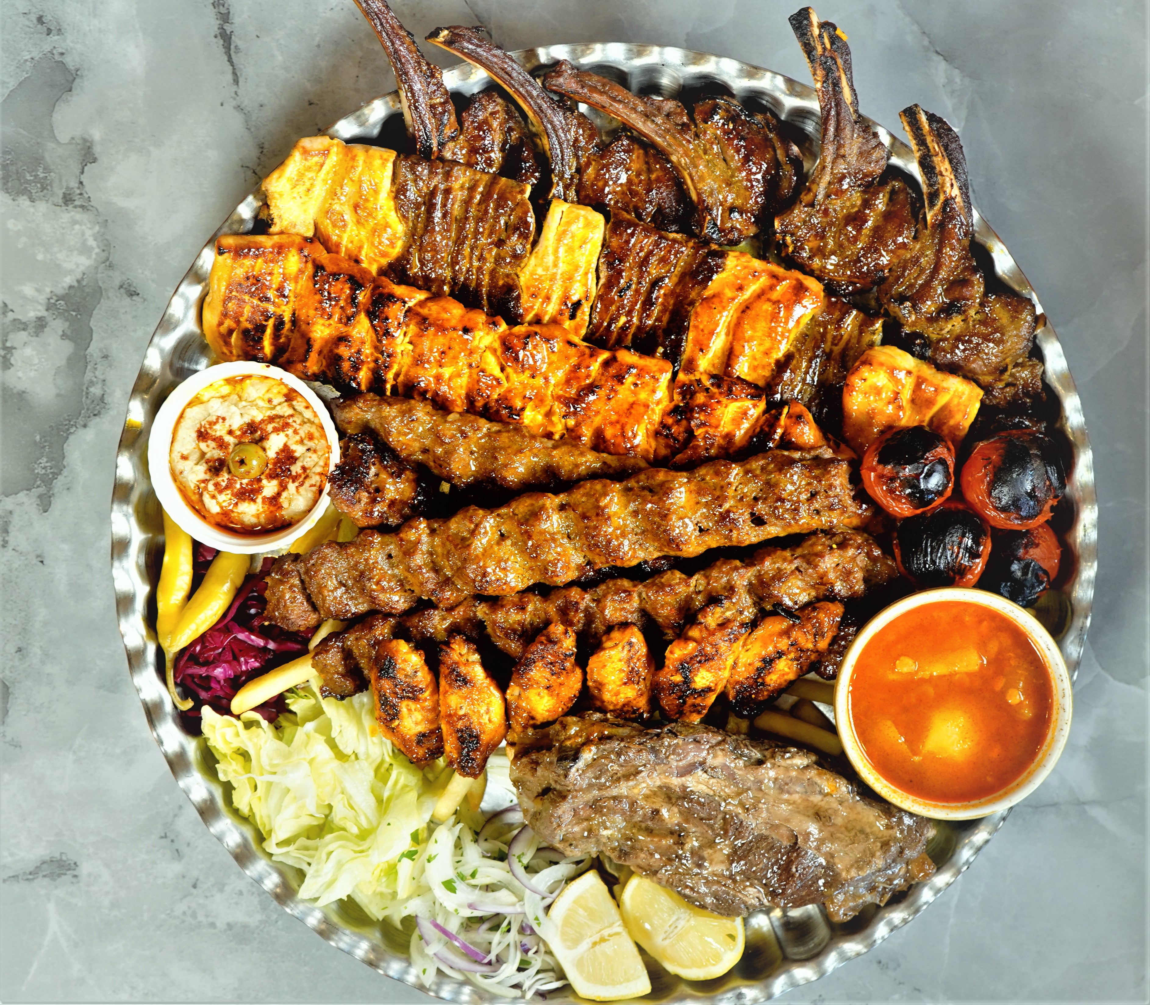 4 SKEWER KOOBIDE, 2 SKEWER CHICKEN KOOBIDEH, 4 SKEWER CHICKEN TIKKA, 4SKEWER LAMB TIKKA, 8PCS LAMB CHIOPS, 4PCS LAMB RIBS,1 FULL ROAST CHICKEN , 4 RICE, 4 NAN.£164.99Halal
