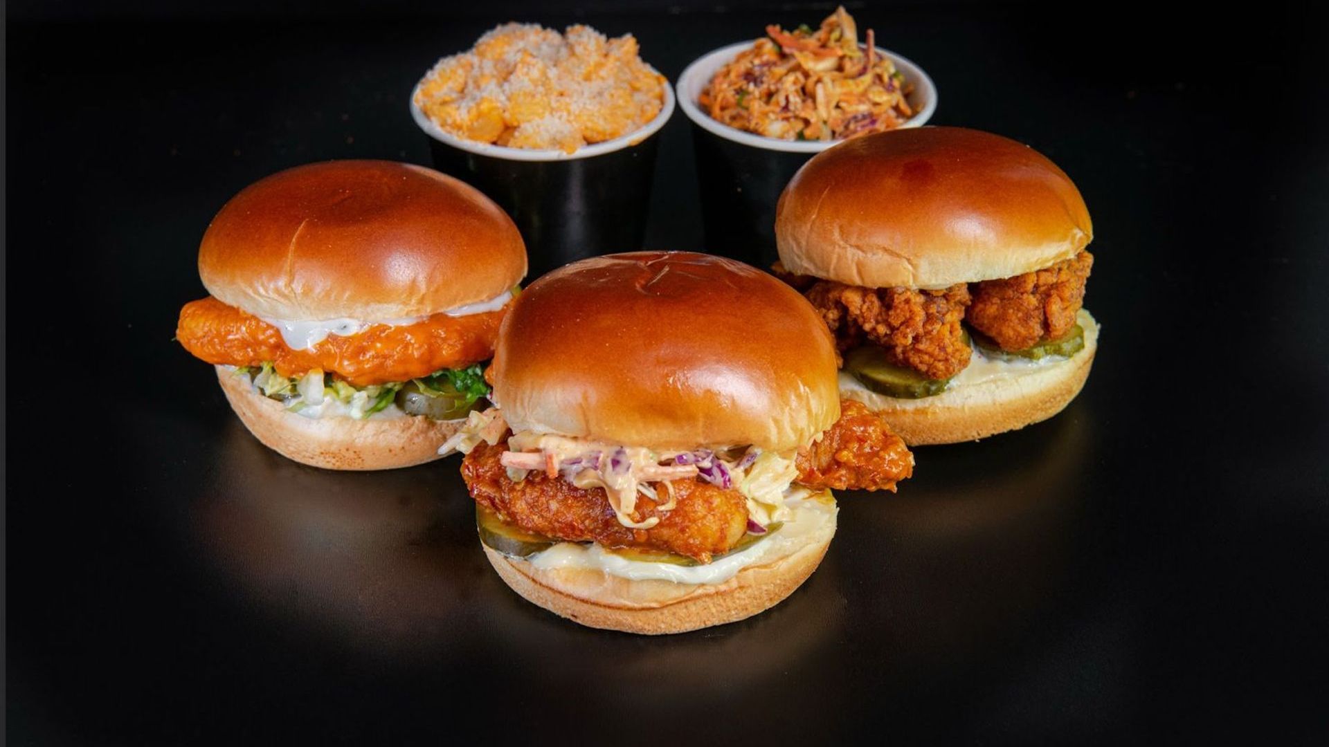 Choose x3 Hot Cornflake crusted chicken sandwiches, 1x Sam's Buffalo Mac n' Cheese, 1x coleslaw, x3 dips£39.50The Trust Us Combo