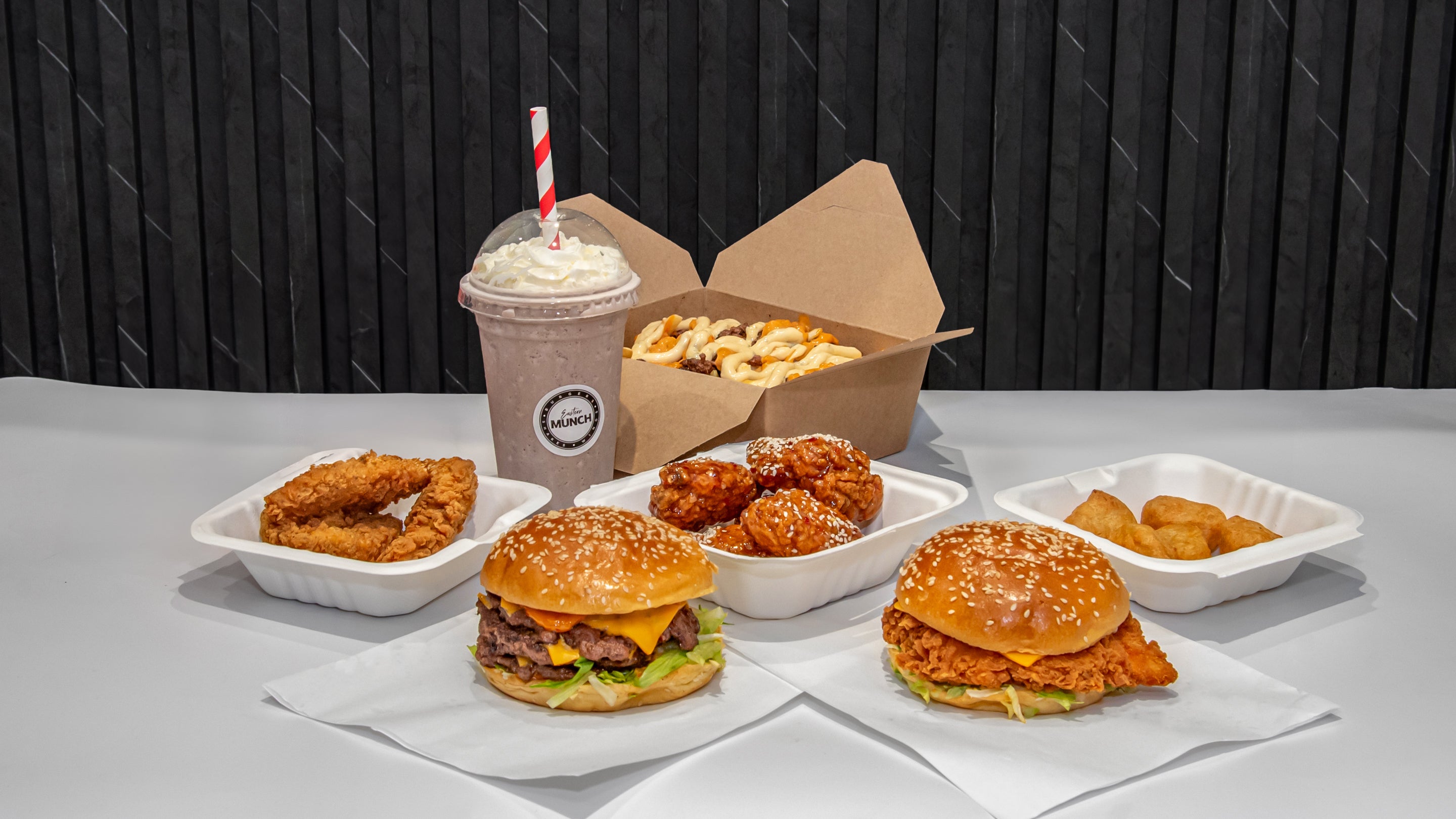 Beef Smash or Classic Chicken burger, 2 chicken strips, masala or regular fries, chicken tikka and House stir fried donner£17.00