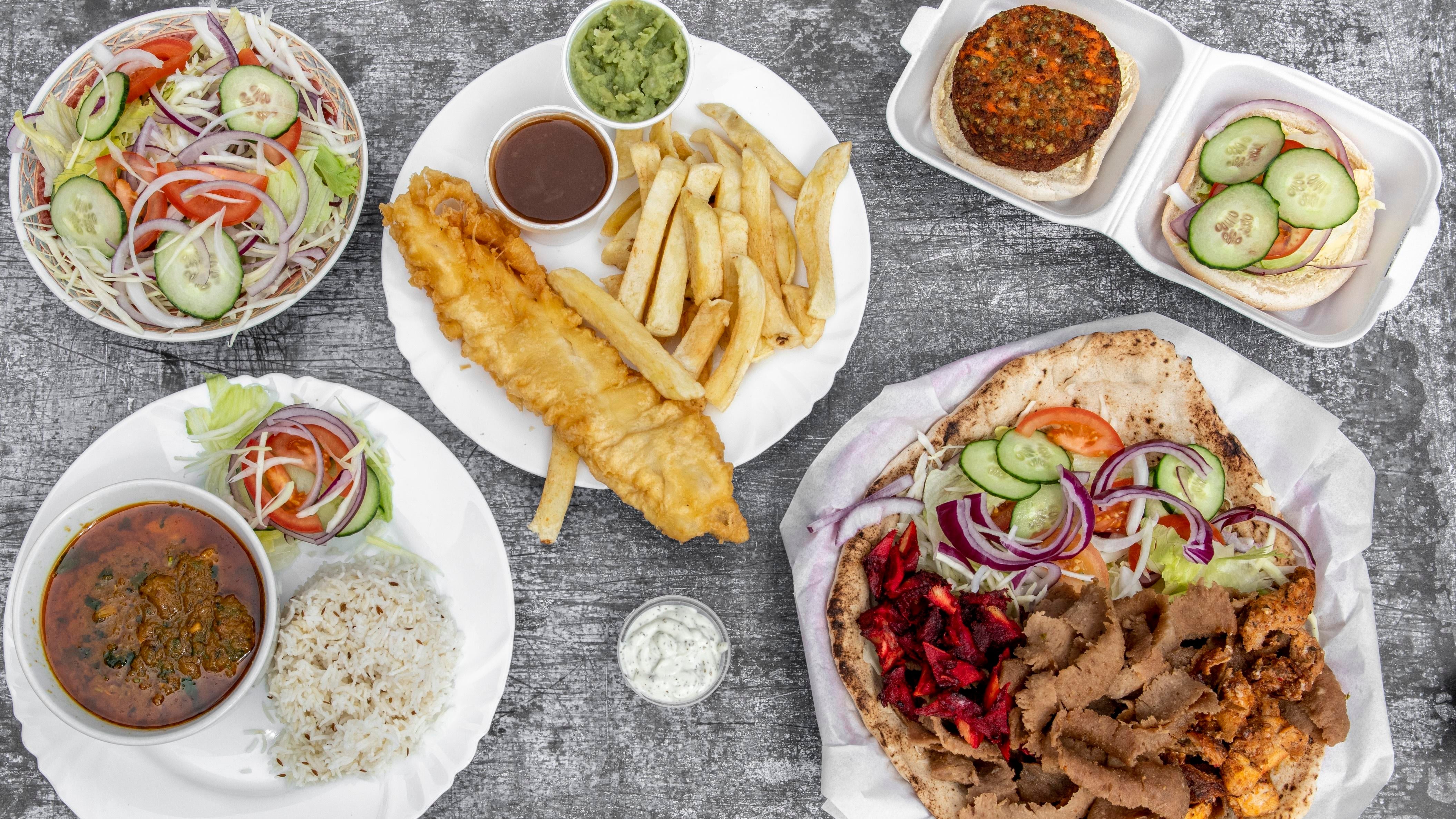 chips, cheese, naan, Doner OR Chicken kebab, salad & sauce£9.99
