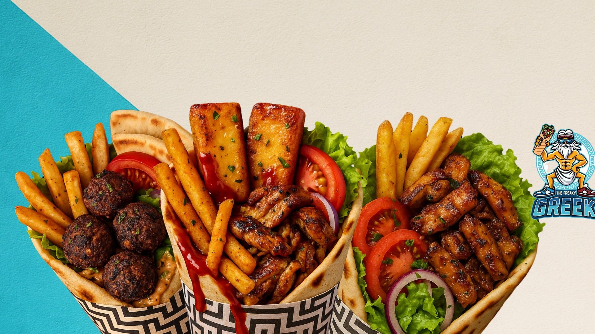 This wrap is unhinged. It’s got juicy chicken gyro, filthy halloumi fries, a fistful of chips, crunchy veg, and your choice of sauce — all smashed into a warm pita like it’s the last thing you’ll eat before blackout. It’s loud. It’s greasy. It’s freakin’ glorious. Handle with dirty hands and zero shame.£11.95The Greek Chic Gyro