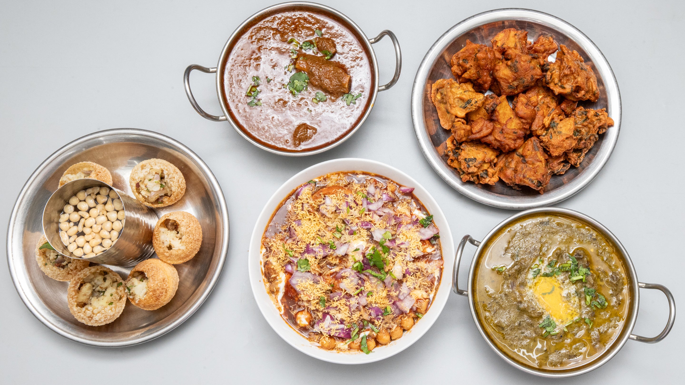(6 pieces). Bite-sized crispy puris filled with meledy of spiced mashed potatoes, chickpeas and tamarind chutney, served with a tangy and aromatic mint-coriander water.£3.99