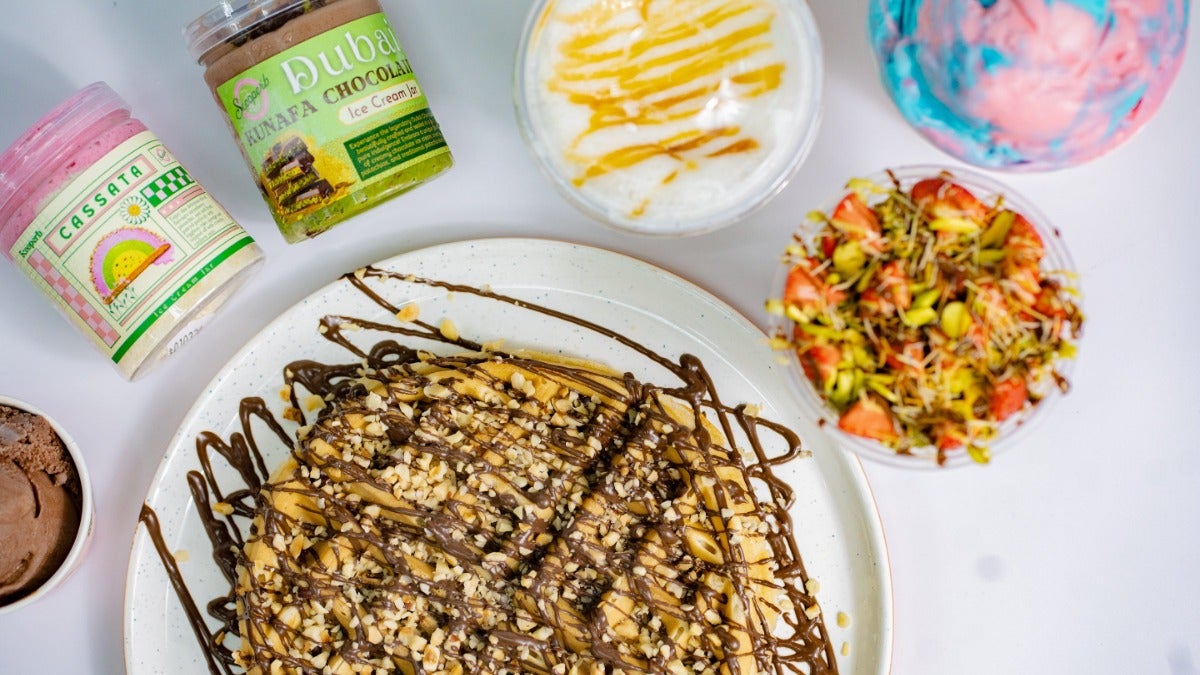 The Pistachio Kunafa Strawberries, inspired by Dubai's viral chocolate, features sweet strawberries, crunchy pistachio kunafa, chocolate and pistachio sauce, pistachio nuts.£12.00PopularDubai Chocolate Ice Cream Sundae
