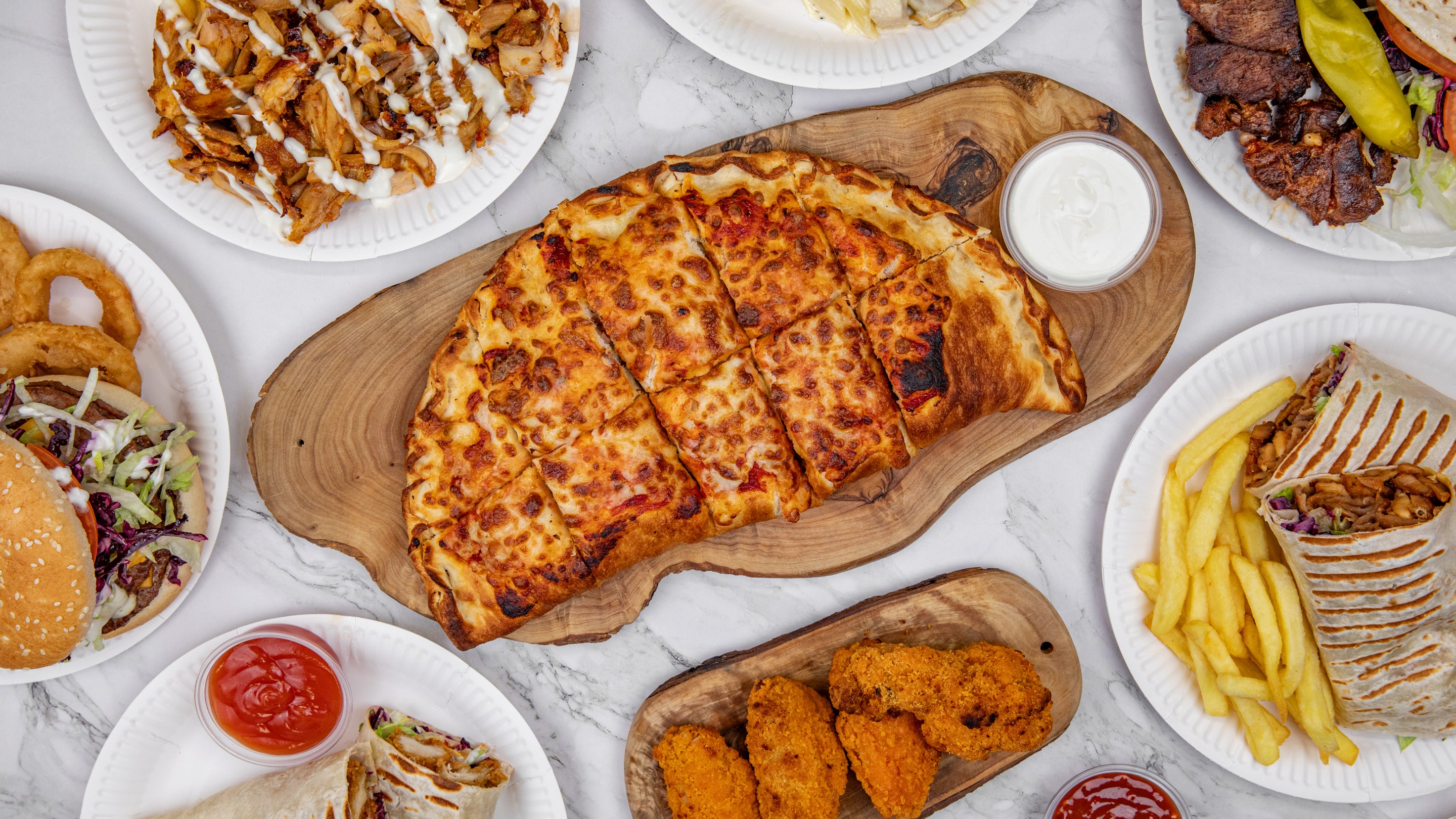 Any 14" pizza, 10" garlic bread with cheese, large doner kebab with salad and sauce, 2 small chips, and 6 chicken wings, 8 chicken nuggets, coleslaw, and 4 cans of drinks.£32.50
