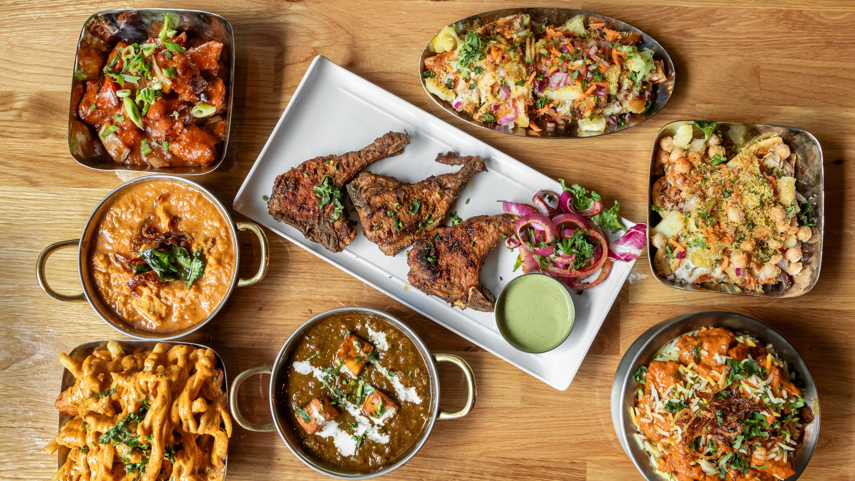 Gobi Manchurian, bhajis, Chole saag, bagara rice, aloo paratha, and mixed salad leaves.£32.76VeganThe Sharing Spice for Four