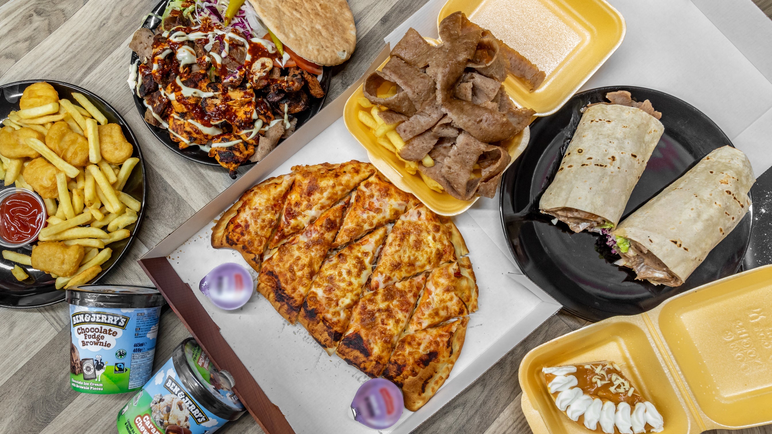Any 14" Pizza, 9" Garlic Bread With Cheese, Large Donner Kebab, 2x Small Chips, 6 Chicken Wings, Coleslaw, 4x Cans Of Drinks & 8 Piece Chicken Nuggets£47.99