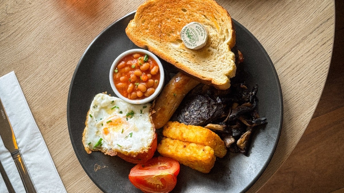 two hearty pork sausage, two rashers crispy streaky bacon, two free-range fried egg, mushrooms, tomato, classic hash browns, Heinz baked beans & thick-cut toast£18.00