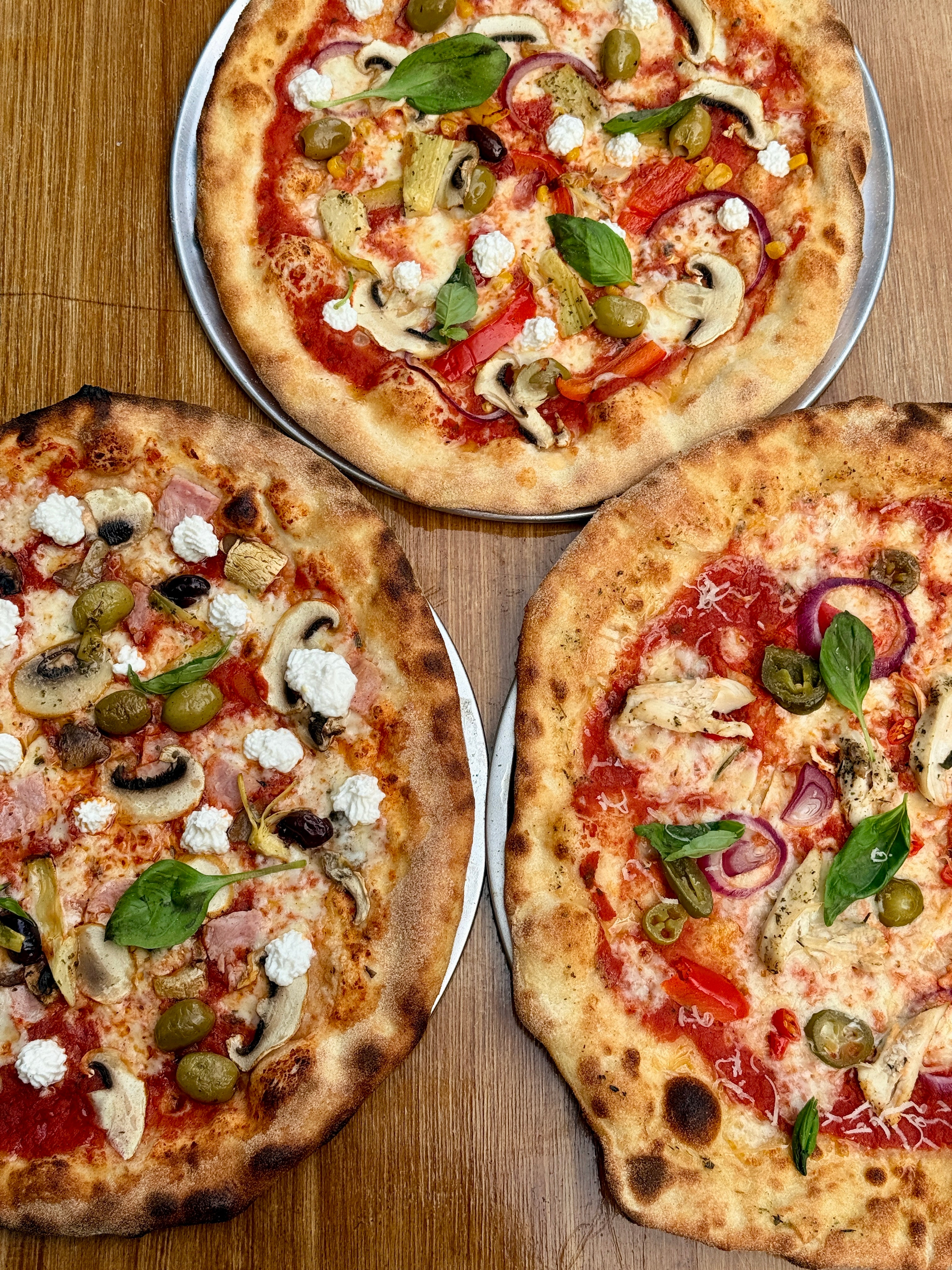 San Marzano tomato base, Italian mozzarella, Olives, Onions, mushrooms, Sweetcorn, roasted peppers, Artichoke hearts, Whipped ricotta, Fresh Basil, Olive oil, Parmesan.900 kcal