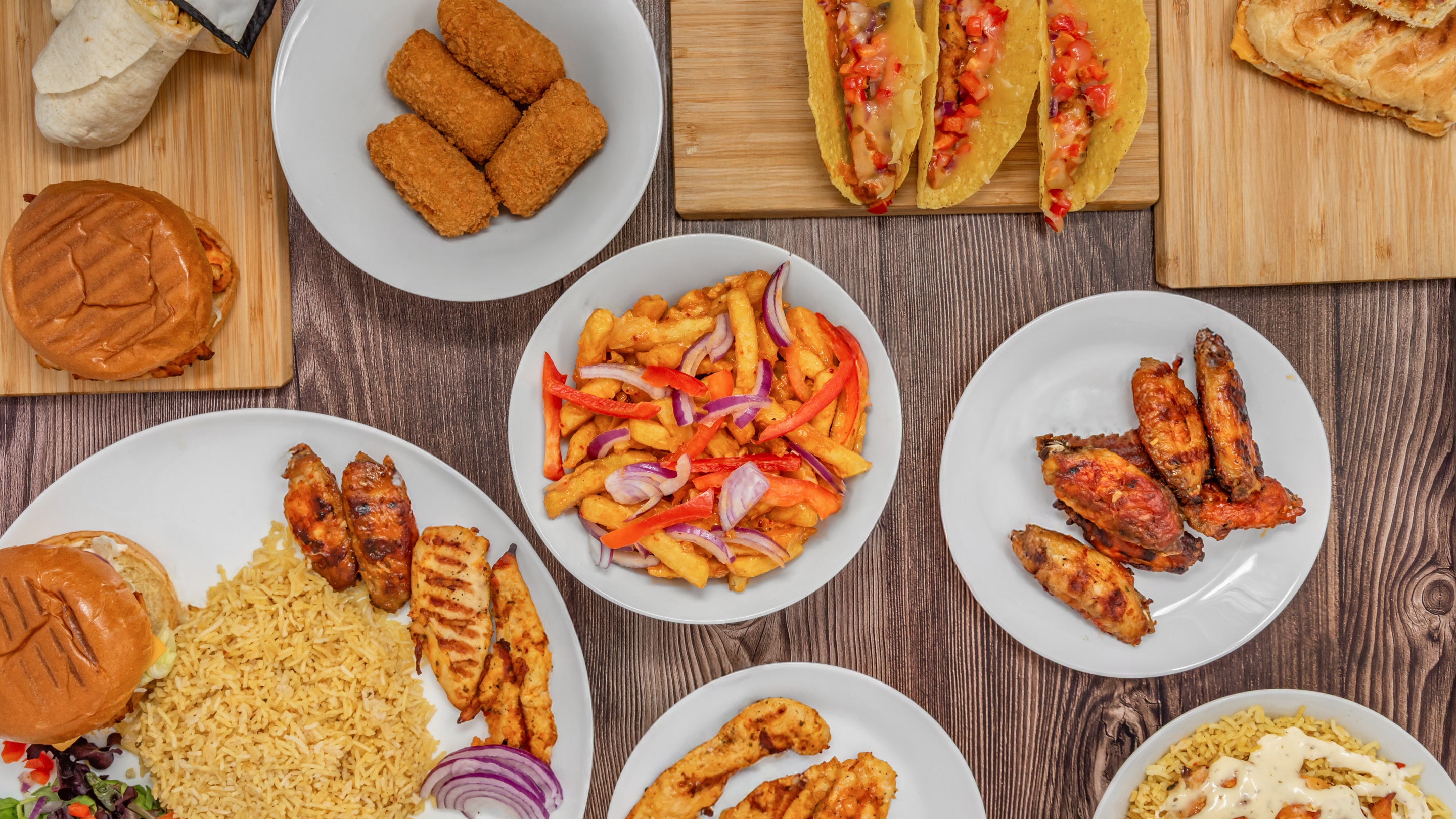 Two grilled burgers, grilled loaded fries or grilled chicken and rice and two drinks.£19.99£26.95Kickin Fried Sharing Box