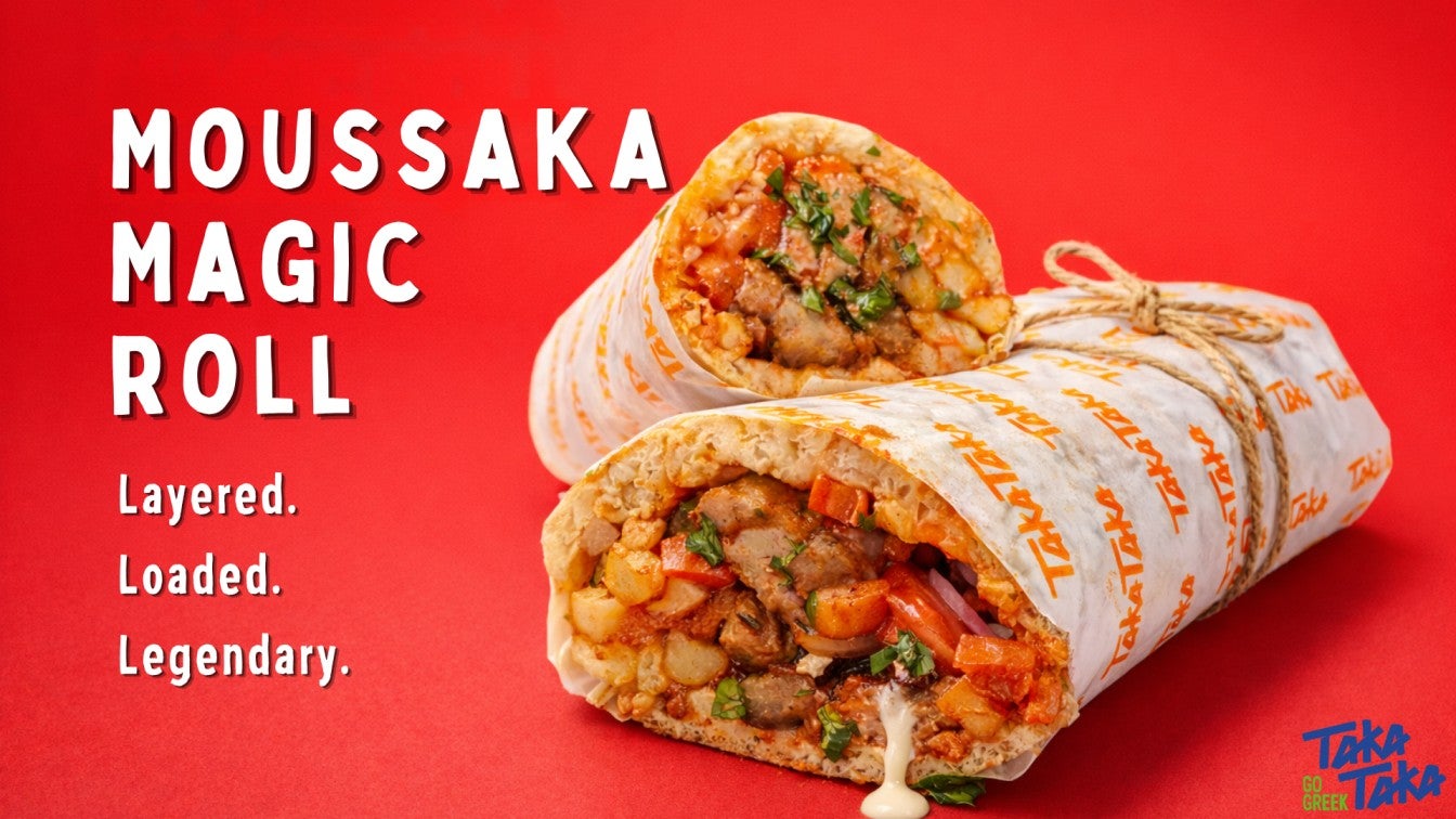 Plant-based gyros with crispy fries, fresh tomato, red onion, and parsley, wrapped in warm pita for a bold, satisfying vegan bite.£9.95Mousaka Magic Roll