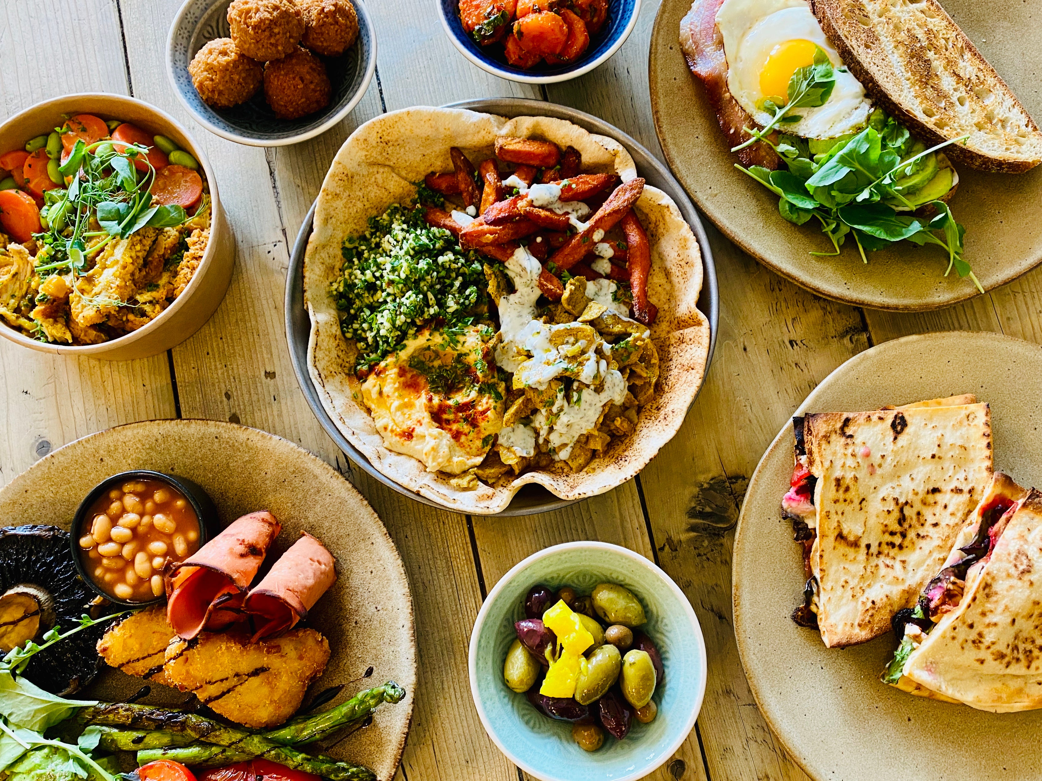 Hearty, comforting fry-up style breakfast plates featuring high-quality local ingredients, from classic meaty full English spreads to vibrant vegan and Mediterranean options.