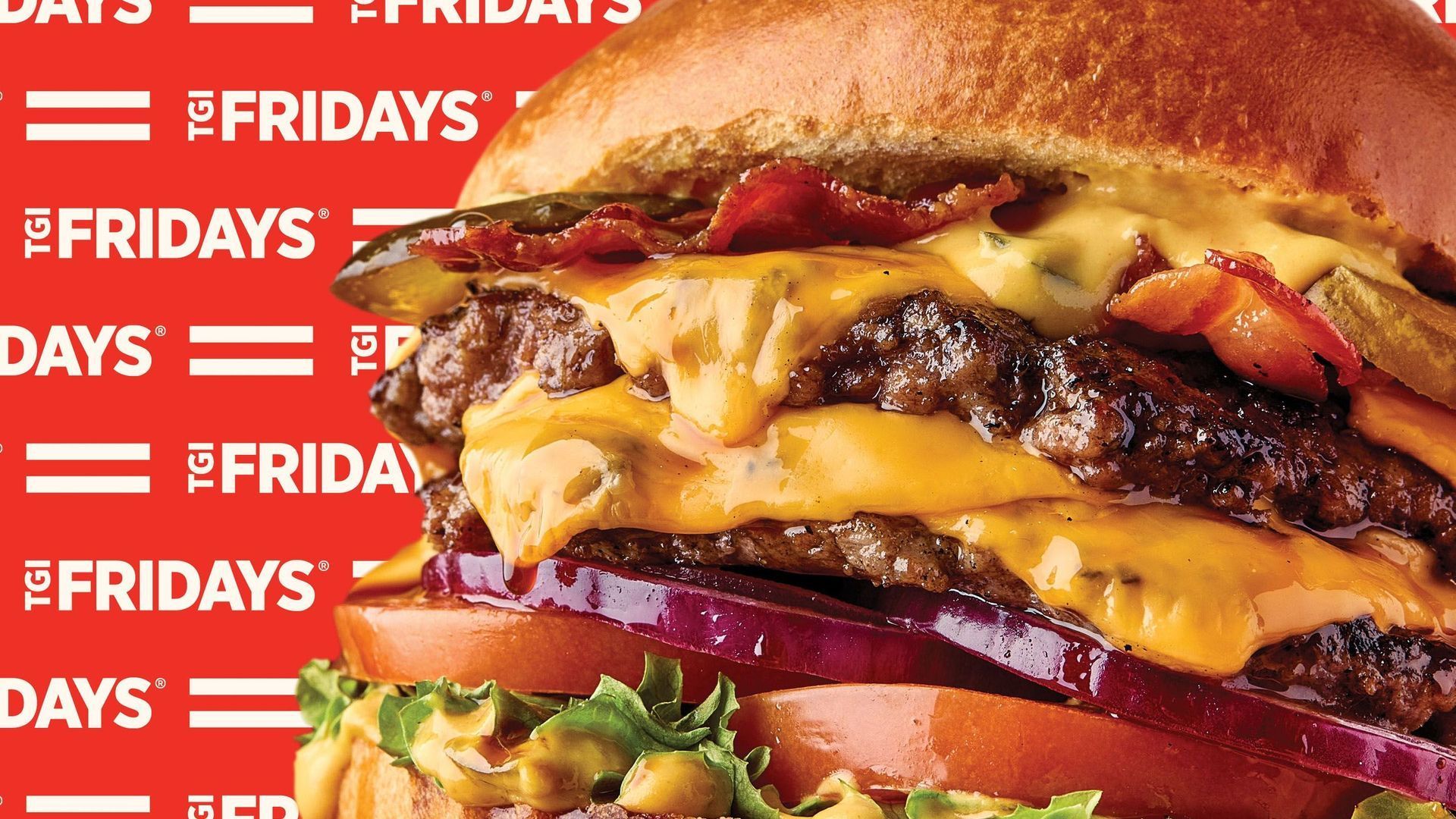 Prime beef smashed patty doubled up coated in our Fridays™ Legendary Glaze, topped with Monterey Jack cheese and crispy bacon, served on a bed of lettuce, mayo, tomato, and pickled red onions (1150 kcal).Served with house fries and a soda of your choice — a true TGI Fridays classic!£19.99