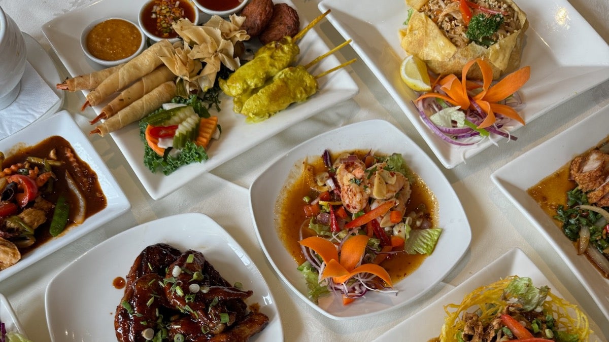 Starters: chicken satay, Thai fish cakes, pork moneybags and king prawns in seaweed and breadcrumbs, soup: hot & sour king prawn soup. 3rd course: crispy duck pancakes. Mains: roast duck red curry with bamboo shoots, chicken with cashew nuts, crispy sea bass in special curry paste, Siam special egg noodles with chicken and prawn. Served with steamed Thai jasmine rice.£81.00