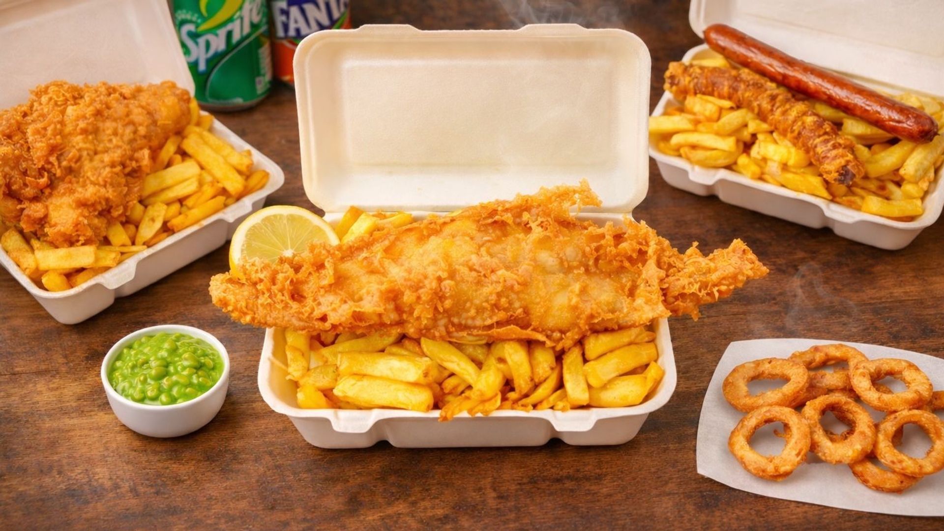 1/2 cod or 1/2 sausage or 4 nuggets, 1/2 chips + can of drink£10.50