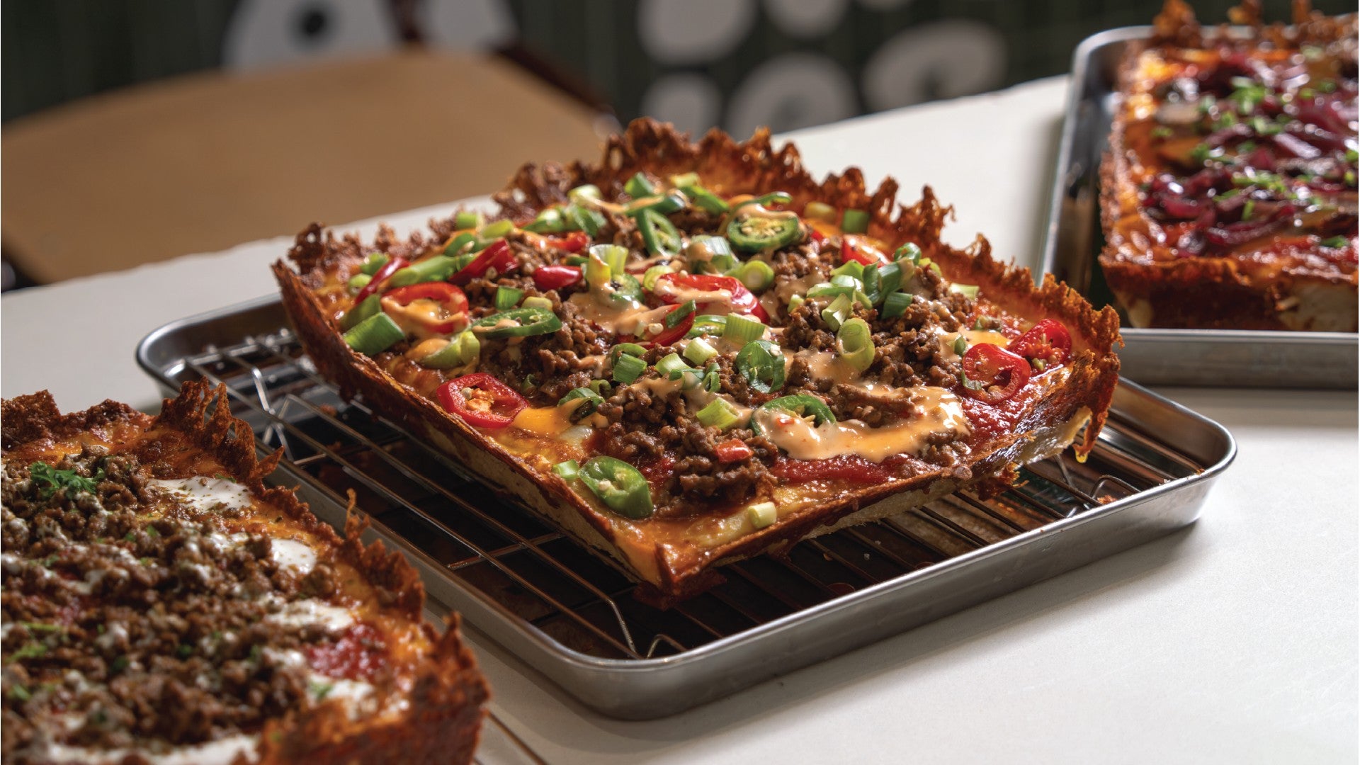 24-Hour fermented soft and bubbly focaccia dough baked in rectangular steel trays. House Detroit tomato sauce with a stringy cheese base and crispy cheese crust. Pizza slices may not come out at the same time.