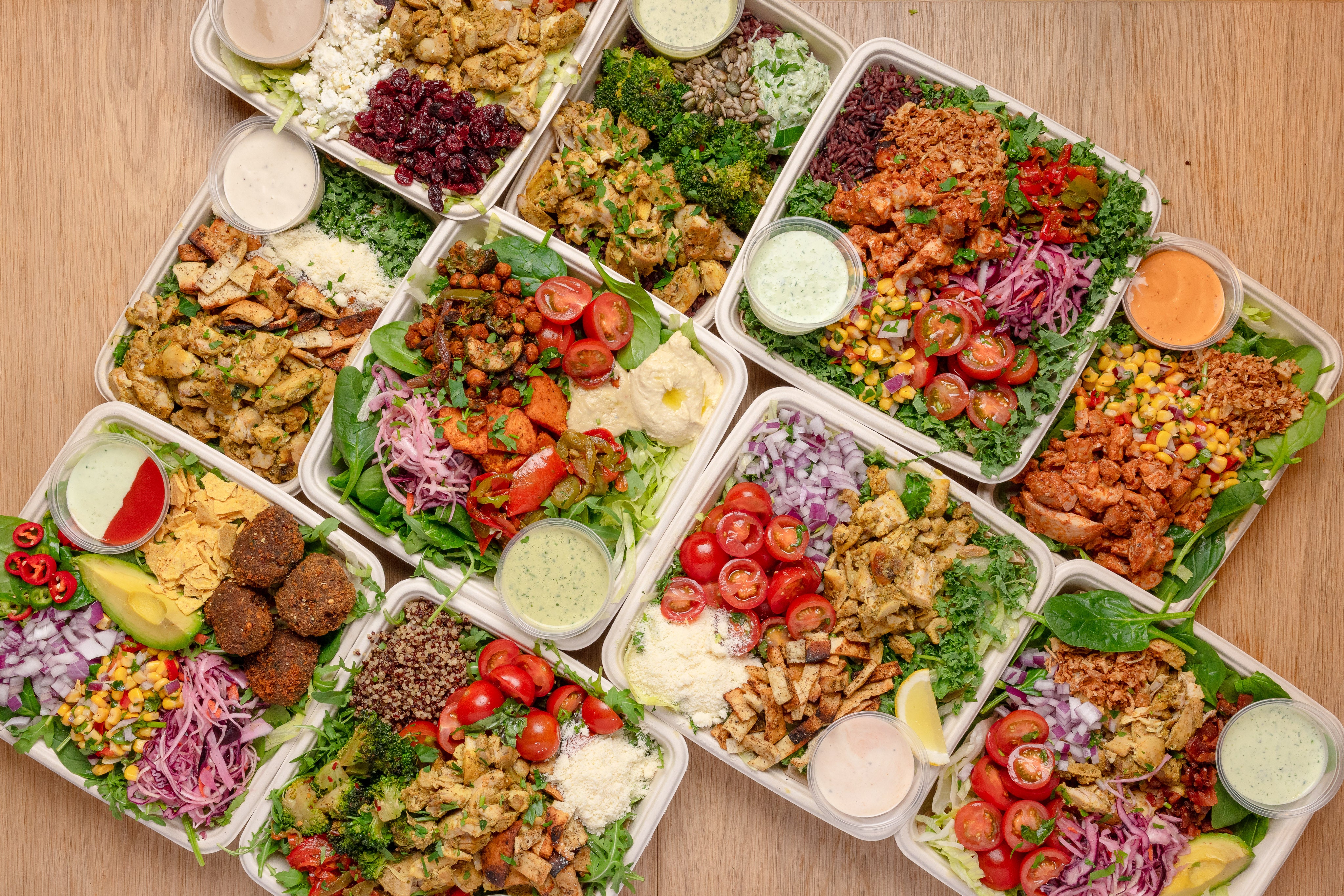 Pick 2 Bases, 1 Dip, 4 Core Toppings, 1 Crunch, 1 Protein/Premium Topped up with a large selection of dressings.