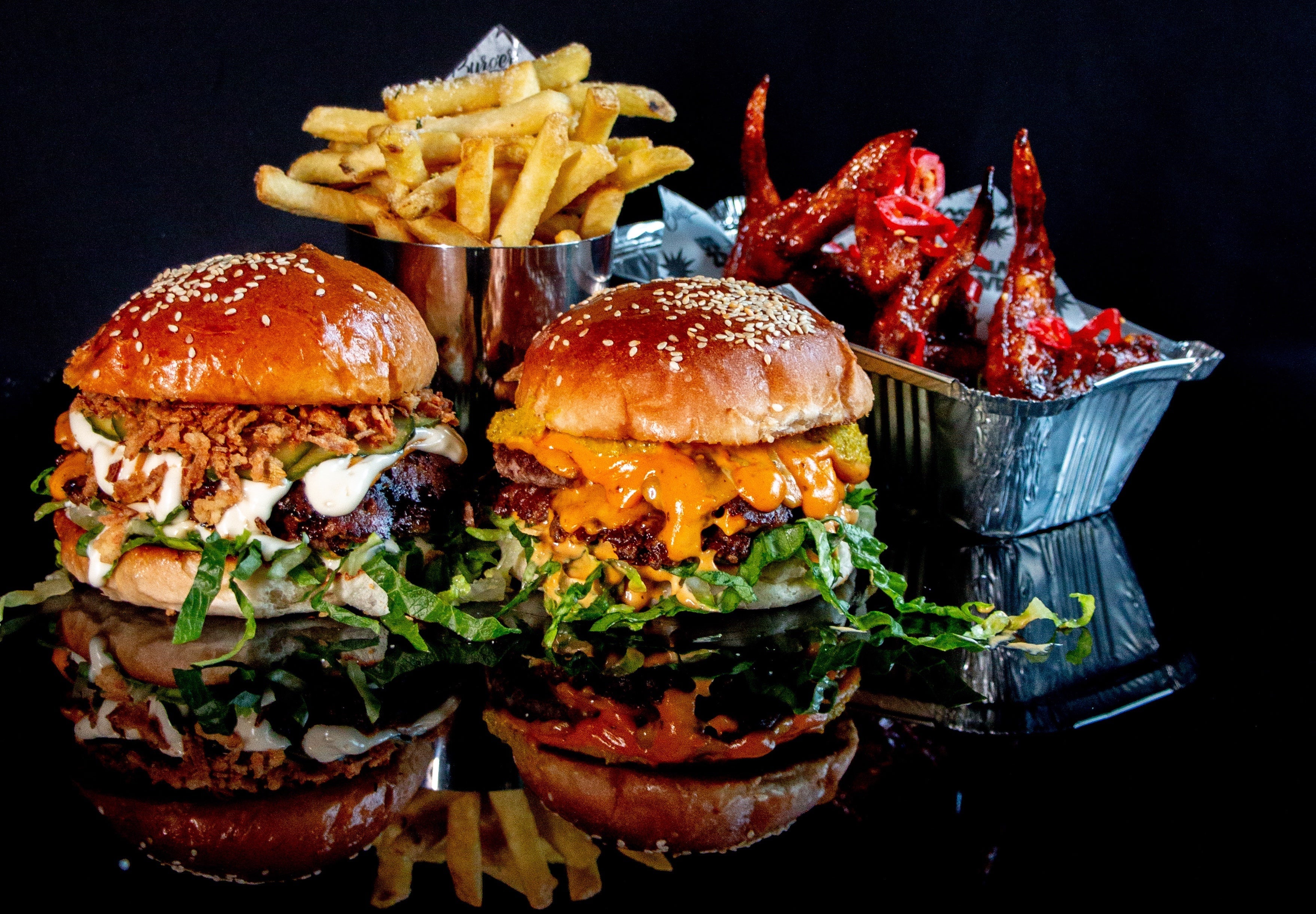 You choose: any two burgers, with any two portions of wings, any two portions fries (skin-on herby fries or Chunky Chips), and any two drinks (you choose).£58.0020% off