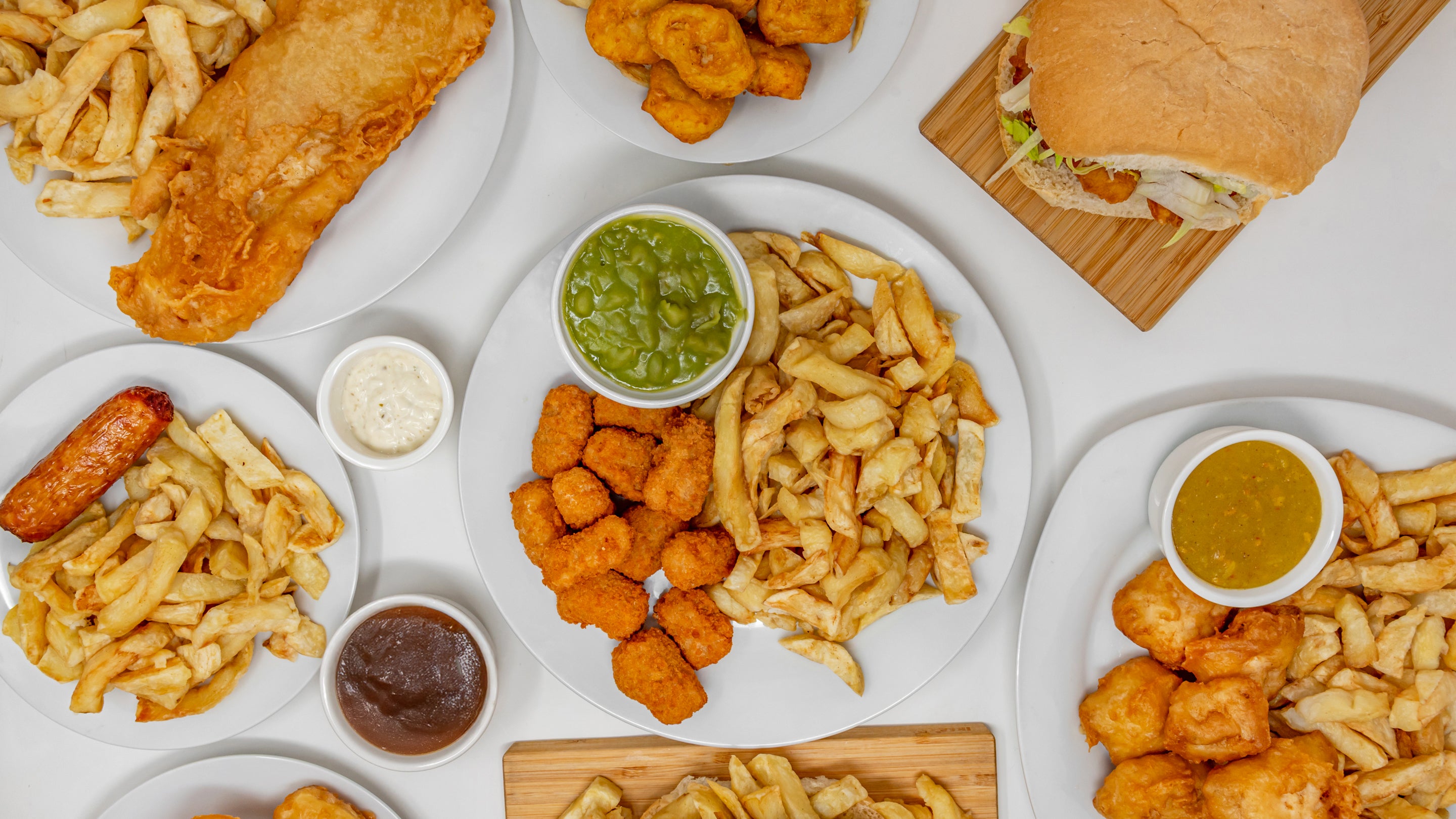 Whole cod, fish and chips, mushy peas and curry sauce.£46.31