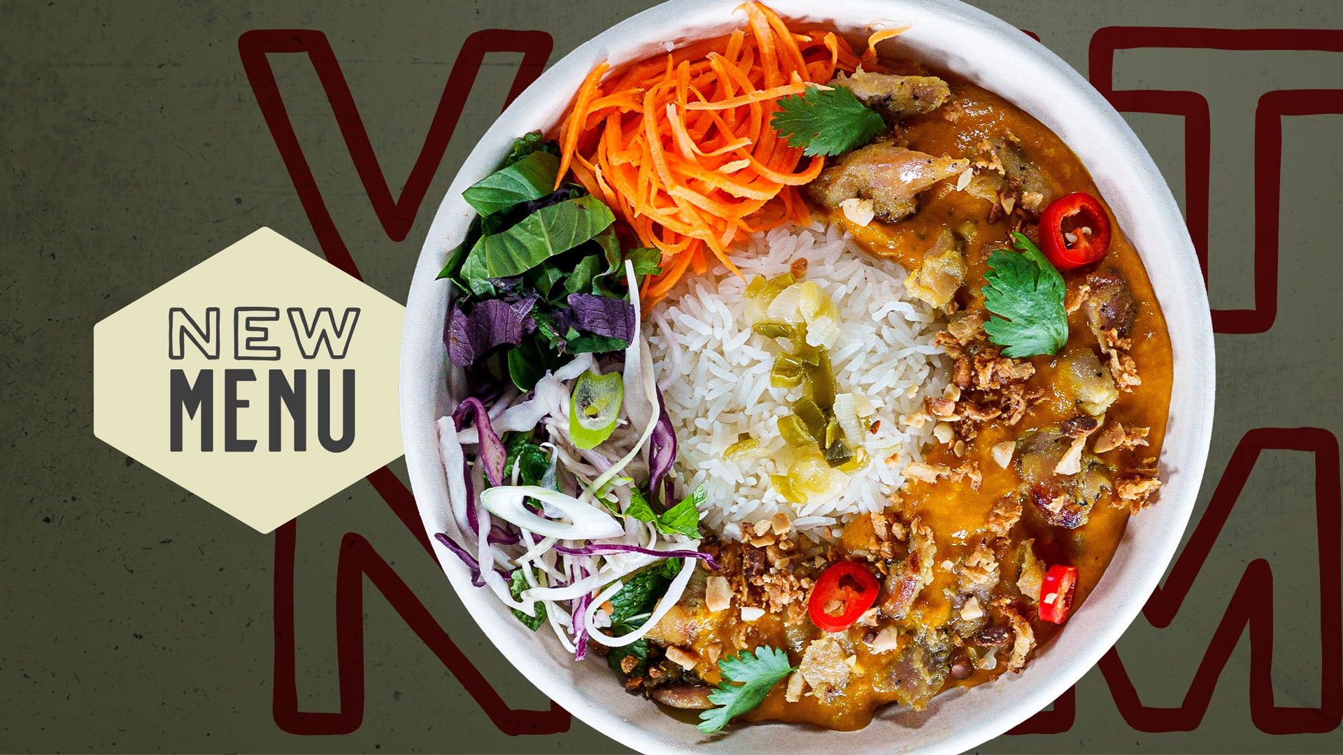 Chicken thigh in a creamy coconut curry. Served with jasmine rice, spring onion oil, crunchy Viet salad, pickled carrot, Viet herbs, crispy shallots, coriander, peanuts and sliced chillies.£12.45Vegan Coconut Curry HOP Box