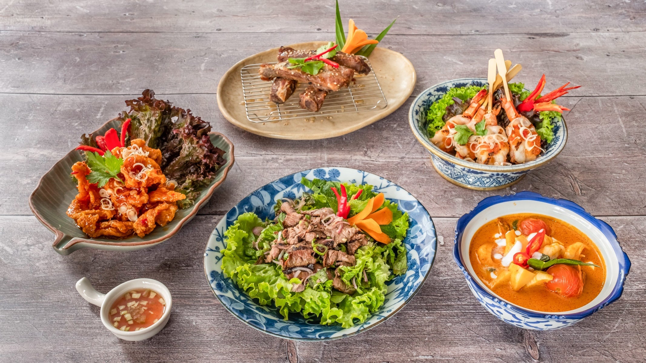 Grilled chicken satay / chargrilled spare ribs / steamed chicken and prawn dumplings / Vegetables spring rolls.£21.90Mieng Bhed ✧