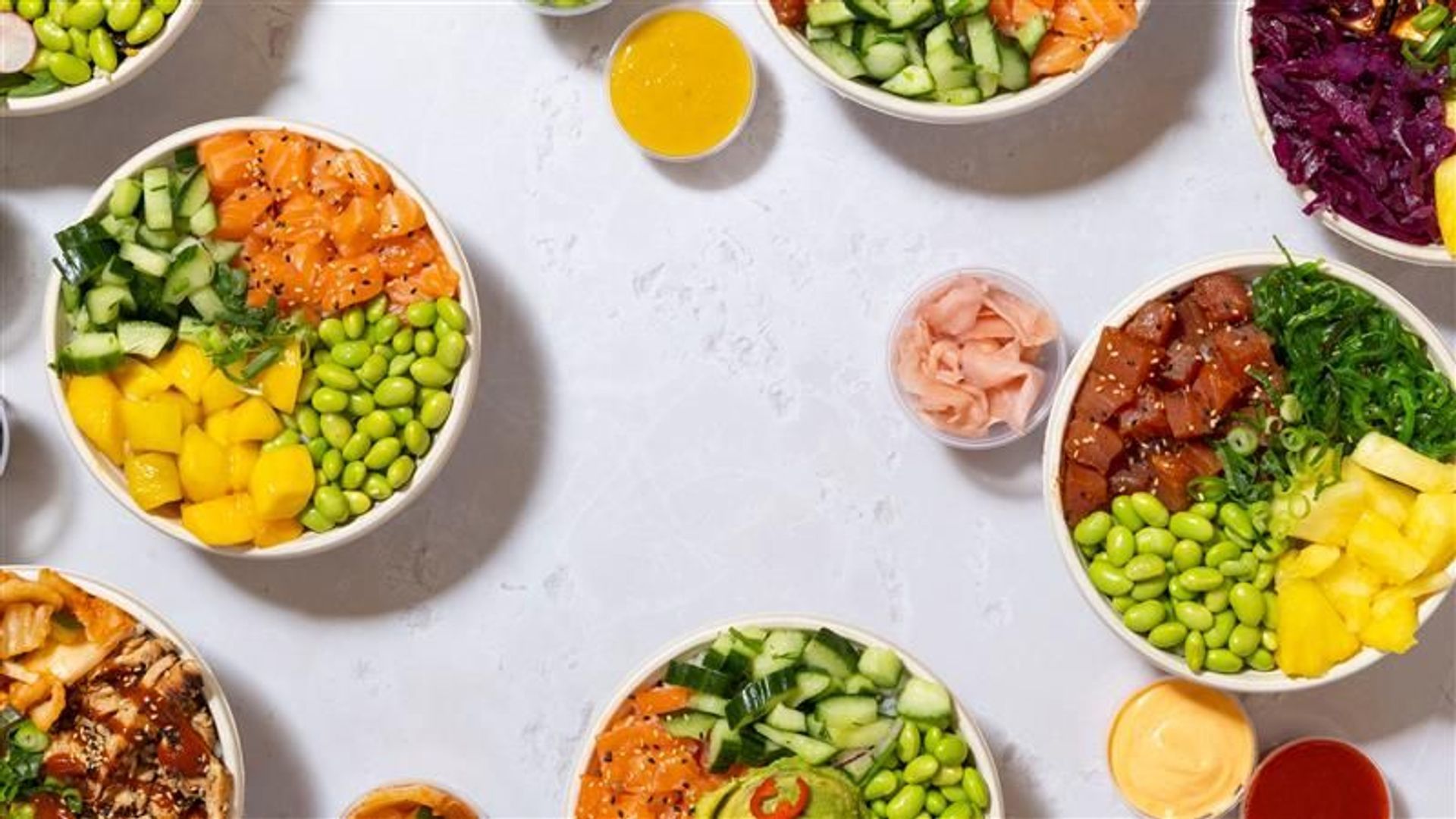 Six fresh and balanced bowls, served half sushi rice, half salad. Includes Classic Ahi Tuna, Yuzu Salmon, Spicy Chicken, Teriyaki Tofu, Miso Aubergine, and California Salmon.£59.95Ocean Selection