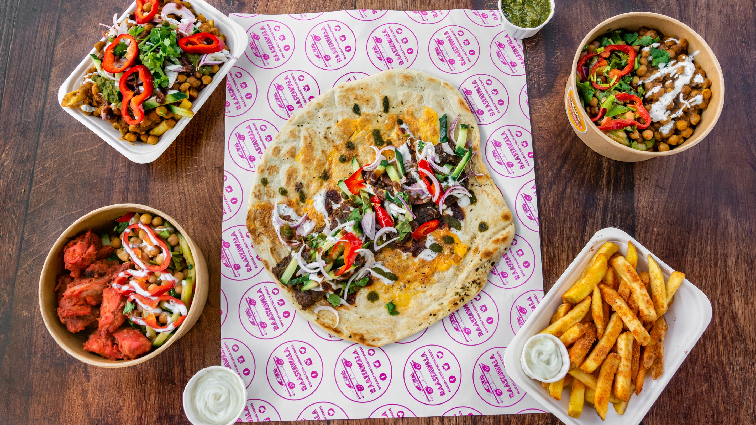 Offering the best Indian street food in town!! Raastawala cooks up street eats from Kolkata. Kati rolls being their signature dish - a soft naan cooked with a egg on top, loaded with your choice of fillings of Tandoori chicken, Spicy lamb kebabs or chickpeas, salads and sauces. A perfect lunch or dinner meal. We use our award winning sauces in each of our dishes too. Come and taste Kolkata at your doorstep!!