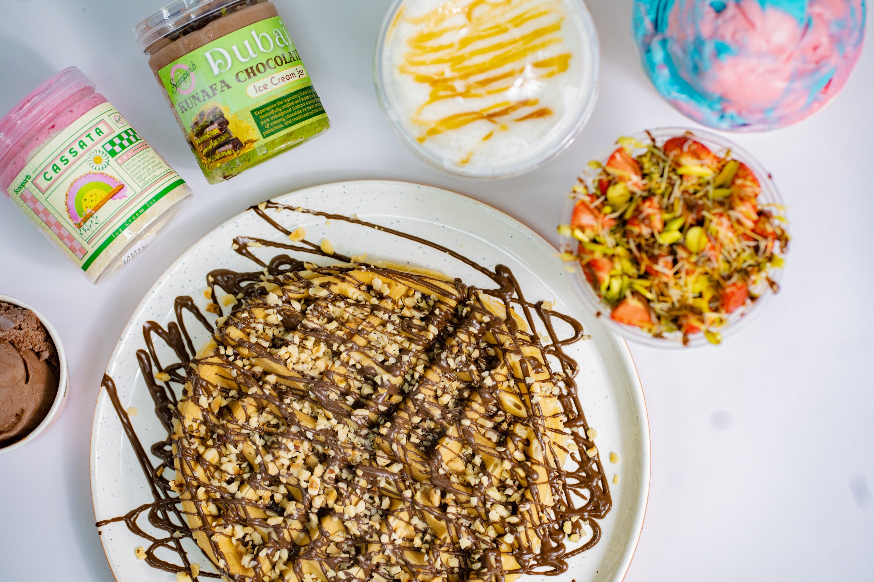 Experience the legendary Dubai Chocolate, beautifully crafted and sealed in a jar of pure indulgence! Embrace a unique fusion of creamy chocolate ice cream, crunchy pistachios, and traditional pistachio kunafa.£6.00VegetarianDubai Chocolate Ice Cream Sundae